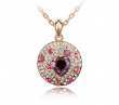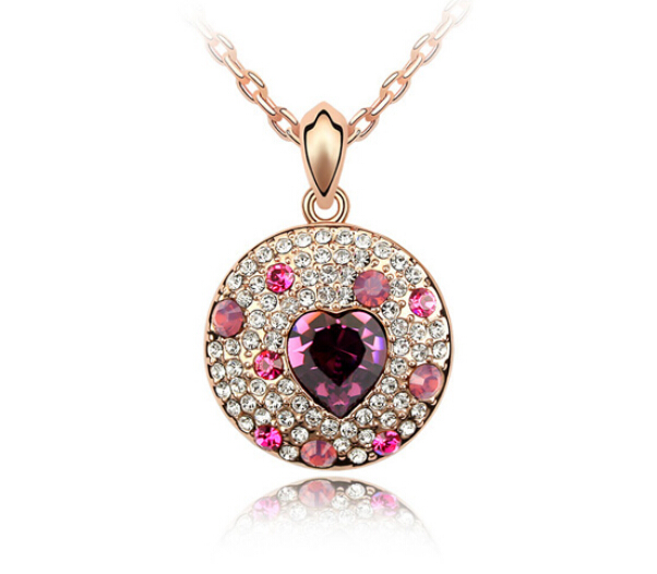 Dije con cadena en baño de oro rosa de 18 quilates, diseño de circulo con corazón de cristal morado e incrustaciones de cristales en color blanco, rosa y morado. Fabricado en una estructura de aleación de platino con rodio sin níquel.
