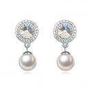 Elegantes aretes en baño de oro blanco de 18 quilates, fino diseño con detalle de perla blanca e incrustaciones de cristales en color blanco y tornasol. Fabricado en una estructura de aleación de platino con rodio sin níquel.