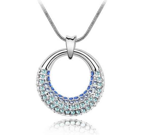 Dije con cadena en baño de oro blanco de 18 quilates, diseño de circulo con incrustaciones de cristales en color azul y azul rey. Fabricado en una estructura de aleación de platino con rodio sin níquel.