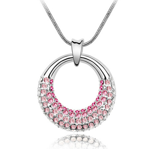 Dije con cadena en baño de oro blanco de 18 quilates, diseño de circulo con incrustaciones de cristales en color fucsia y rosa. Fabricado en una estructura de aleación de platino con rodio sin níquel.