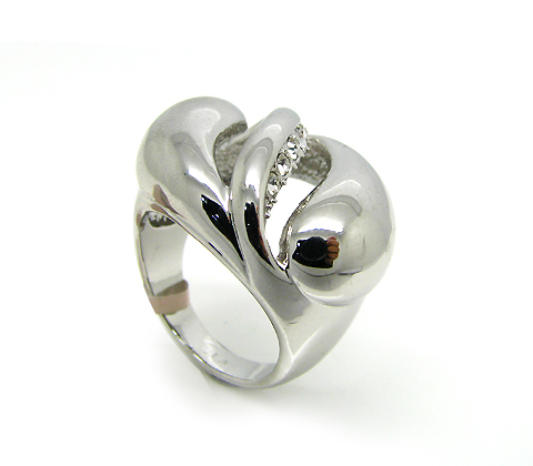 Encantador anillo, en baño de oro blanco de 18 quilates, exclusivo diseño, estilo olas e incrustaciones de cristales color blanco. Fabricado en una estructura de aleación de platino con rodio sin níquel.