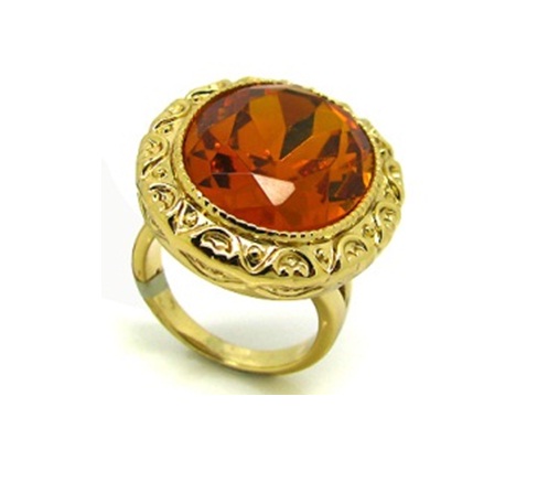 Majestuoso anillo, en baño de oro amarillo de 18 quilates, con cristal ámbar corte cojín, detalles en relieve e incrustaciones de cristales en color blanco. Fabricado en una estructura en aleación de platino con rodio sin níquel.
