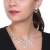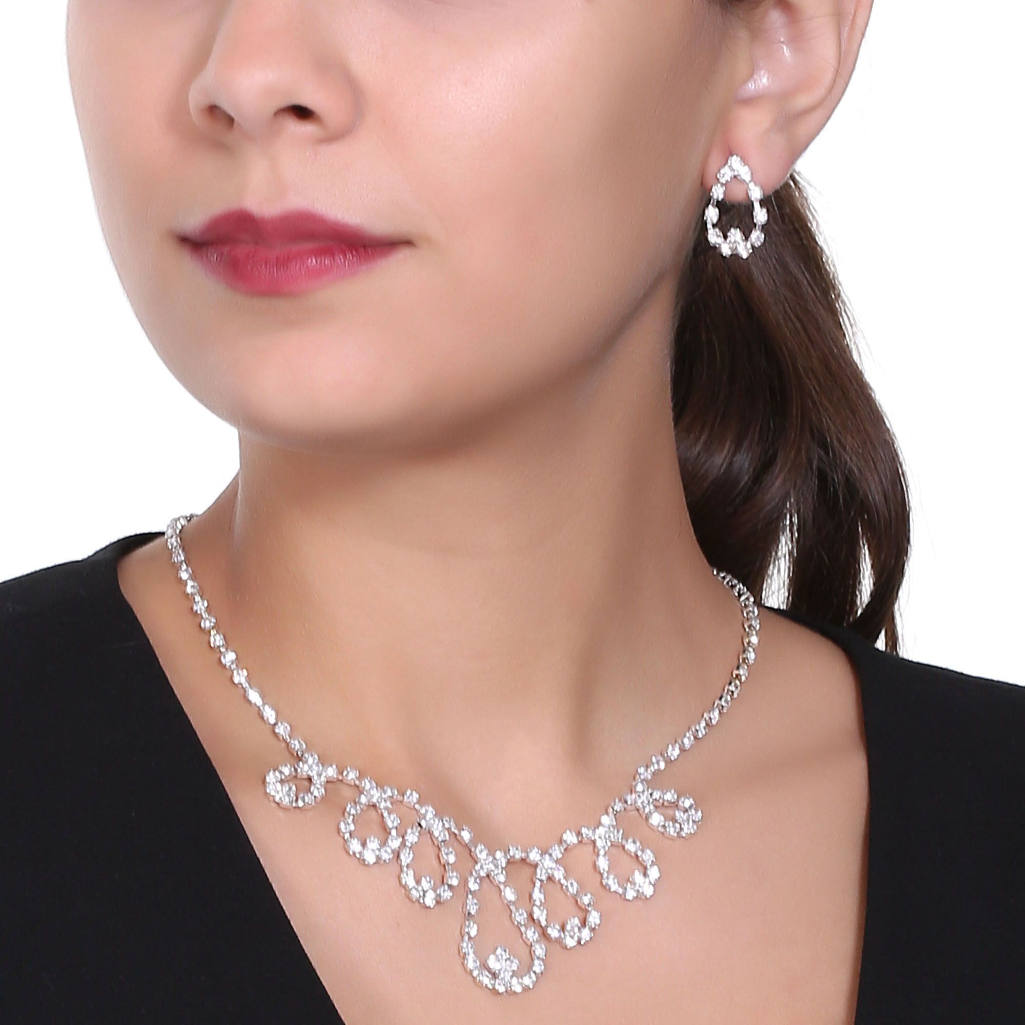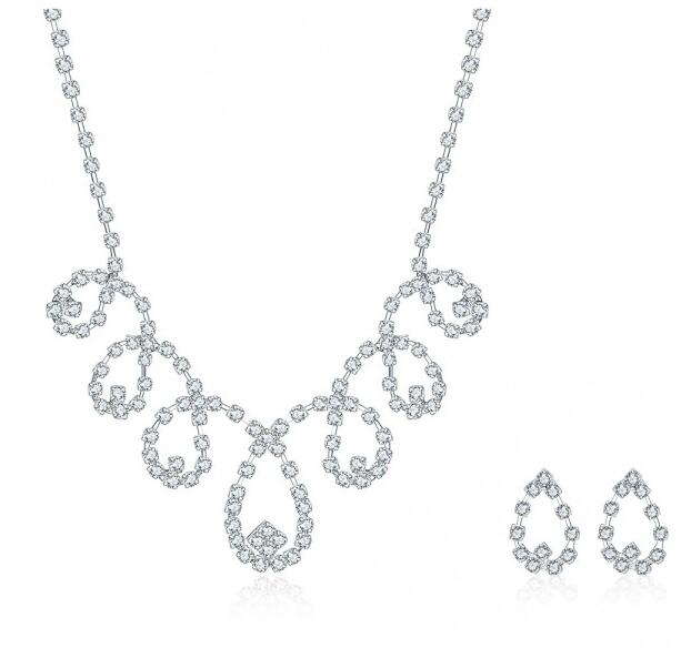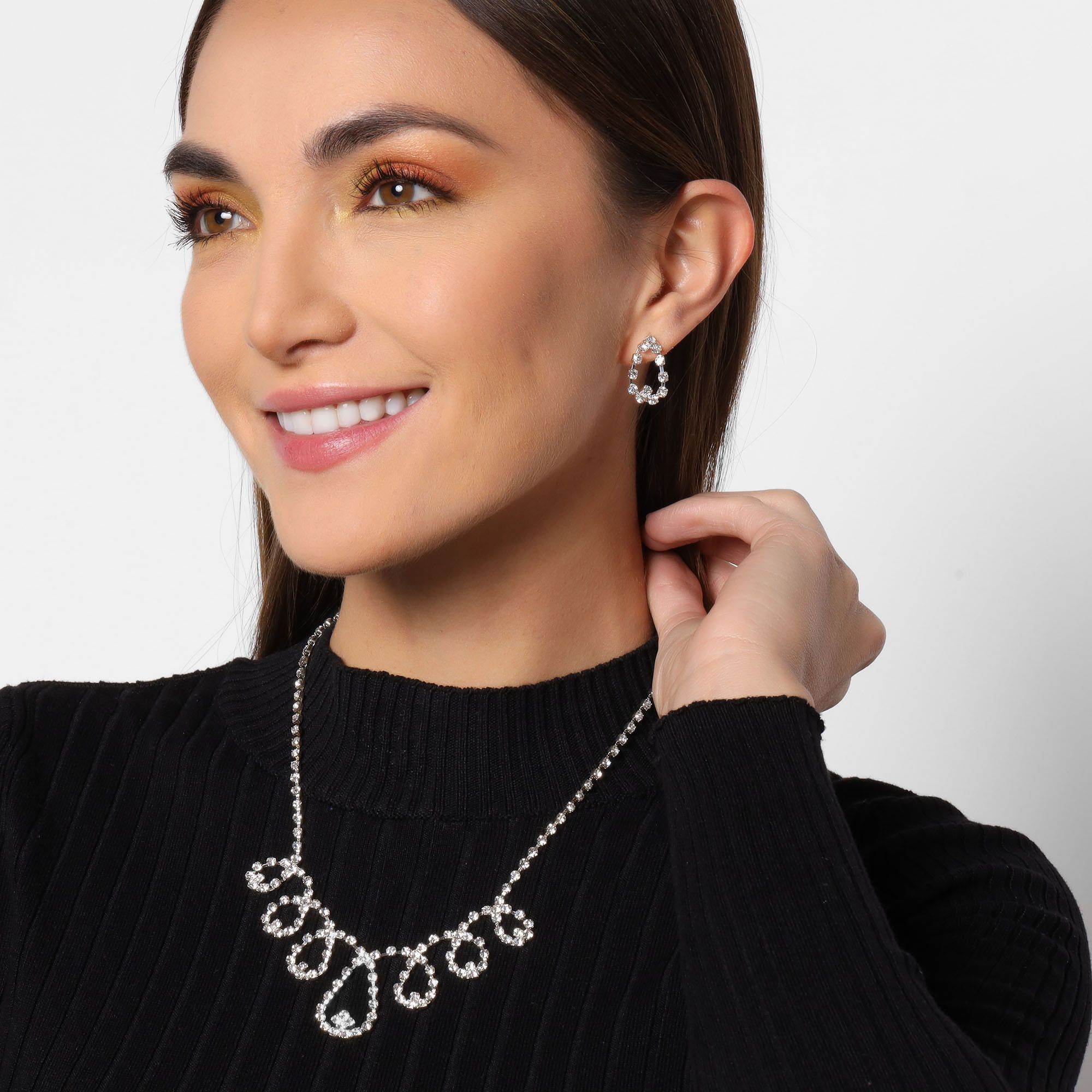 Lindo juego de aretes y collar en baño de oro blanco de 18 quilates, diseño de gotas con incrustaciones de cristales en color blanco. Fabricado en una estructura de aleación de platino con rodio sin níquel.
