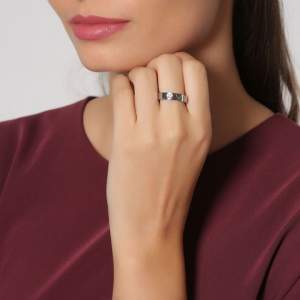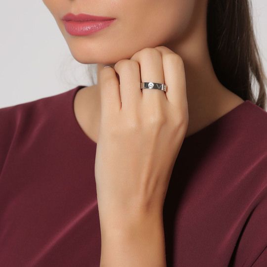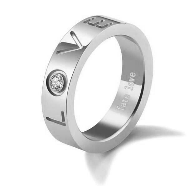 Precioso anillo, de acero inoxidable color blanco, con grabado de leyenda "LOVE" e incrustación de cristal color blanco.