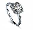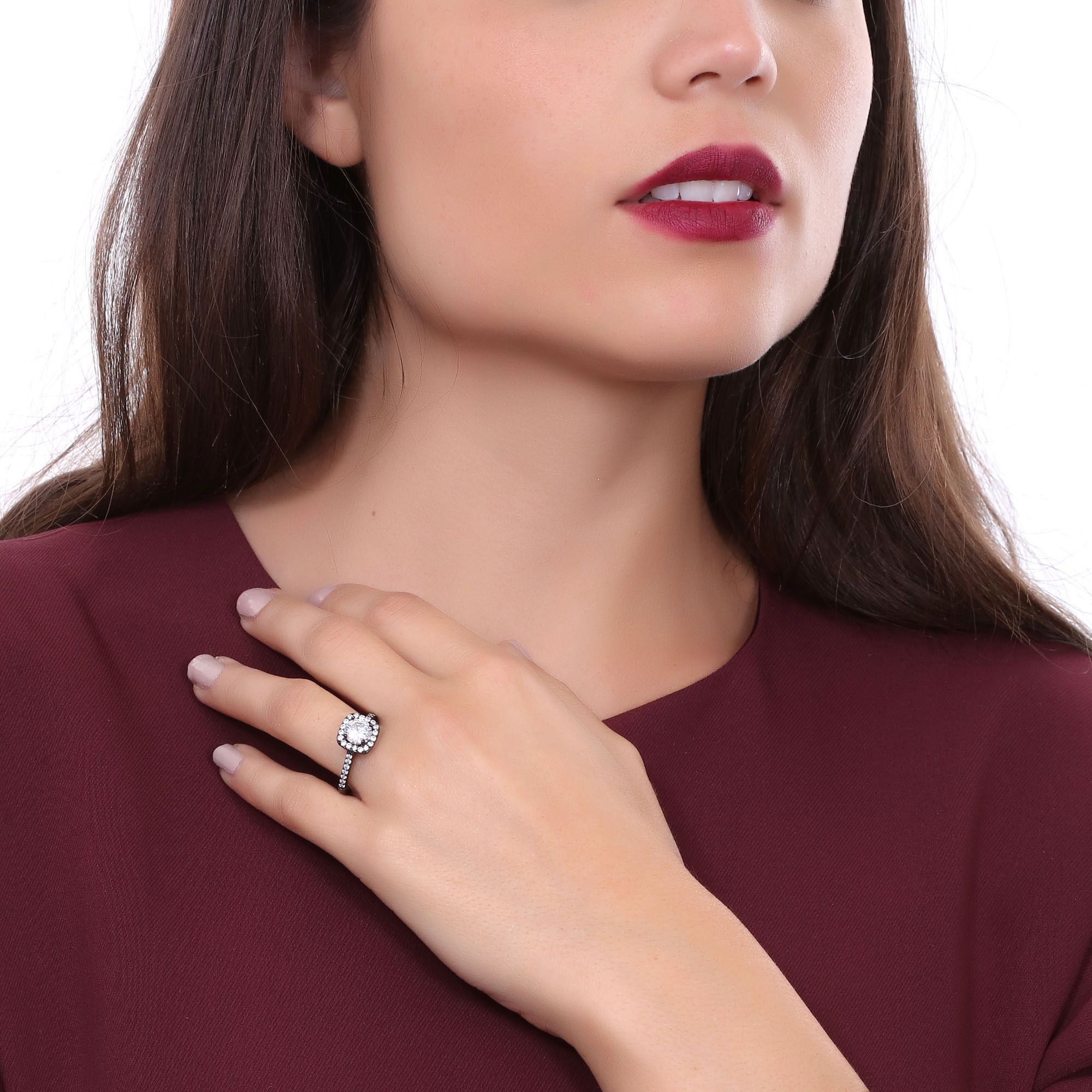 Precioso anillo, en baño de oro blanco de 18 quilates, acabado color negro, fino diseño con cristal blanco corte brillante e incrustaciones de cristales color blanco. Fabricado en una estructura de aleación de platino con rodio sin níquel.