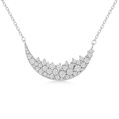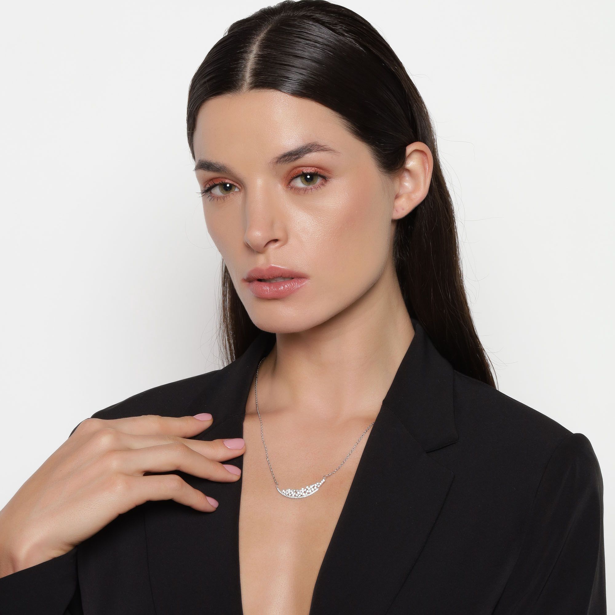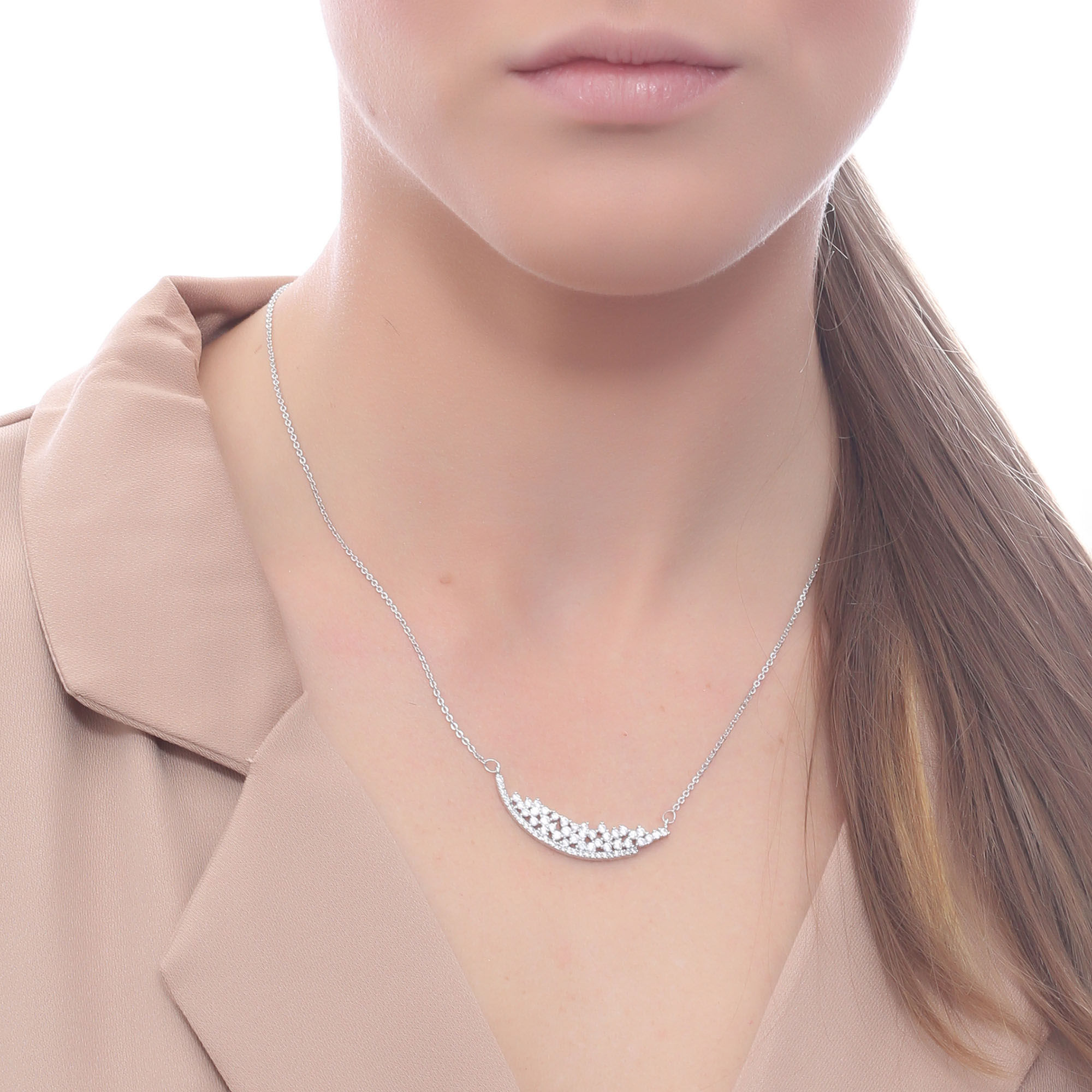 Collar en baño de oro blanco de 18 quilates, fino diseño con incrustaciones de cristales corte brillante en color blanco. Fabricado en una estructura de aleación de platino con rodio sin níquel.