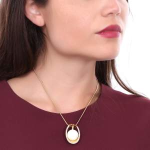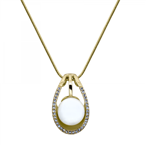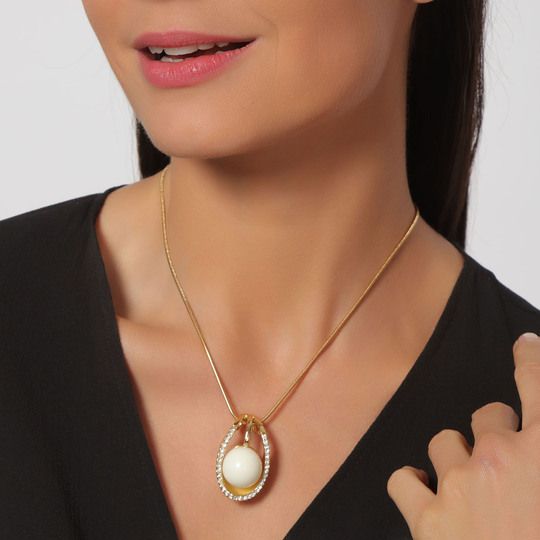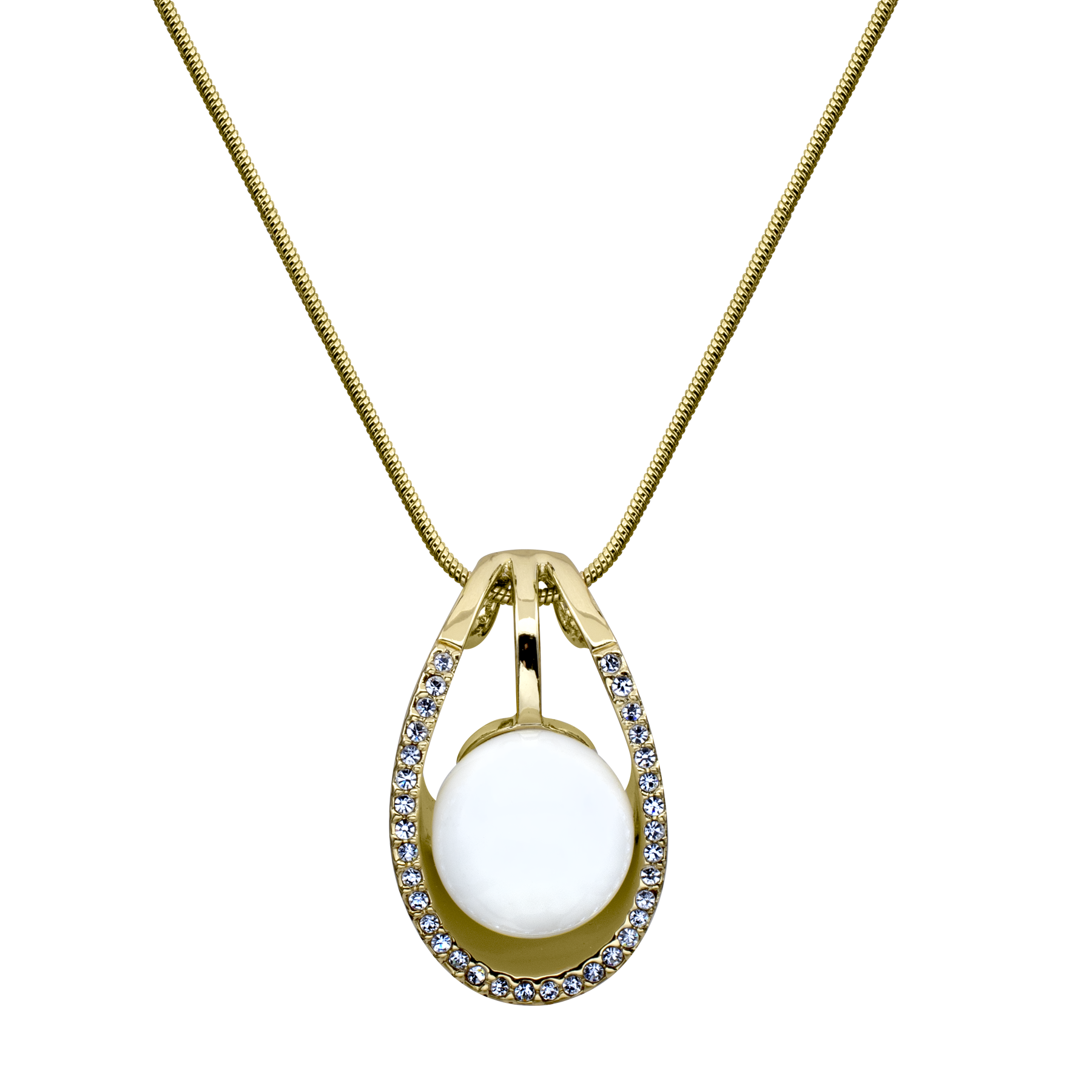 Elegante dije con cadena en baño de oro amarillo de 18 quilates con perla beige e incrustaciones de cristales blancos. Fabricado en una estructura de aleación de platino con rodio sin níquel.