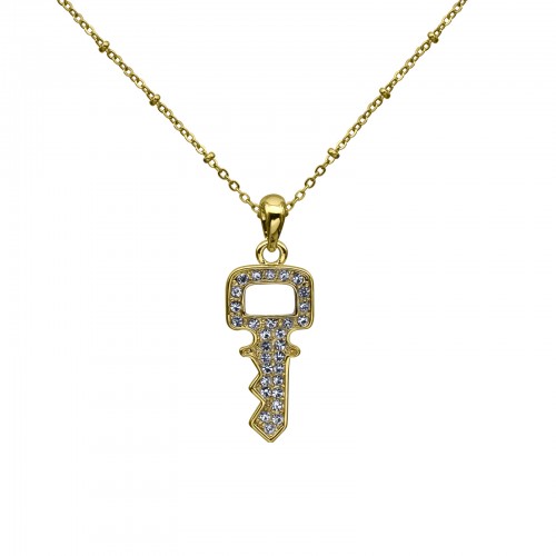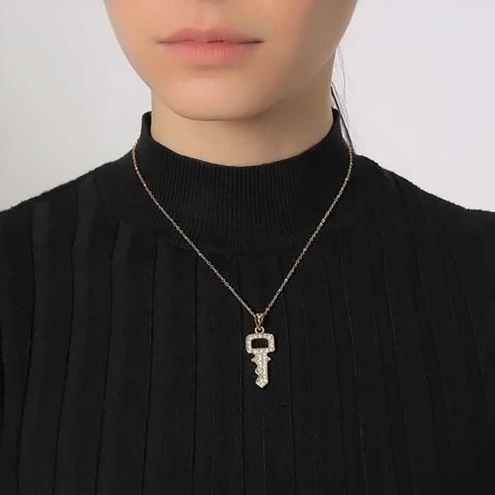 Lindo dije con fina cadena en baño de oro amarillo de 18 quilates en forma de llave con incrustaciones de cristales blancos. Fabricado en una estructura de aleación de platino con rodio sin níquel.