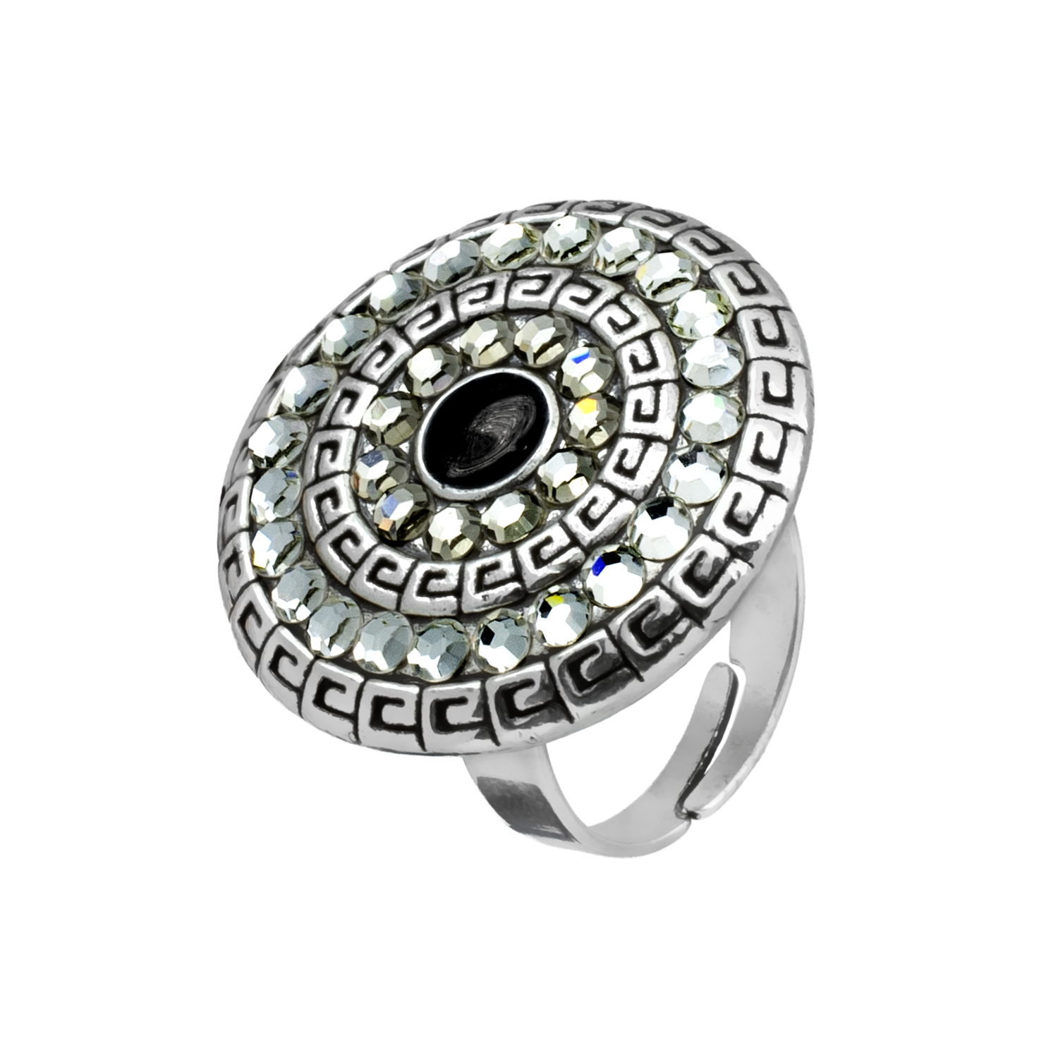 Original anillo, en baño de oro blanco de 18 quilates, diseño circular, con grabado de grecas, acabado antiguo, detalle en color negro, cristales humo e incrustaciones de cristales blancos. Fabricado en una estructura de aleación de platino con rodio sin níquel.