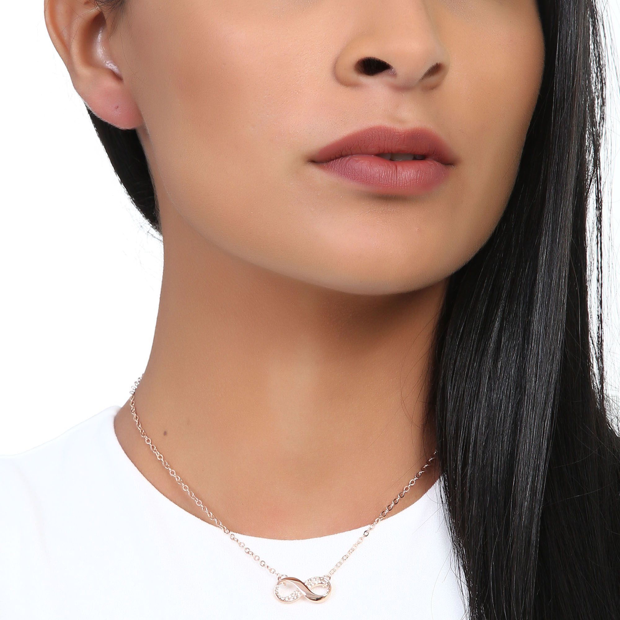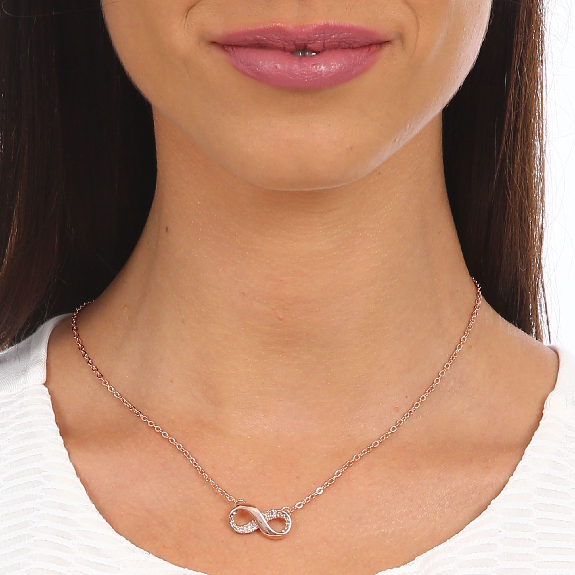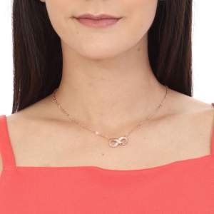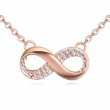Collar en baño de oro rosa de 18 quilates, diseño de infinito con incrustaciones de cristales en color ámbar. Fabricado en una estructura de aleación de platino con rodio sin níquel.