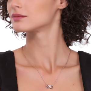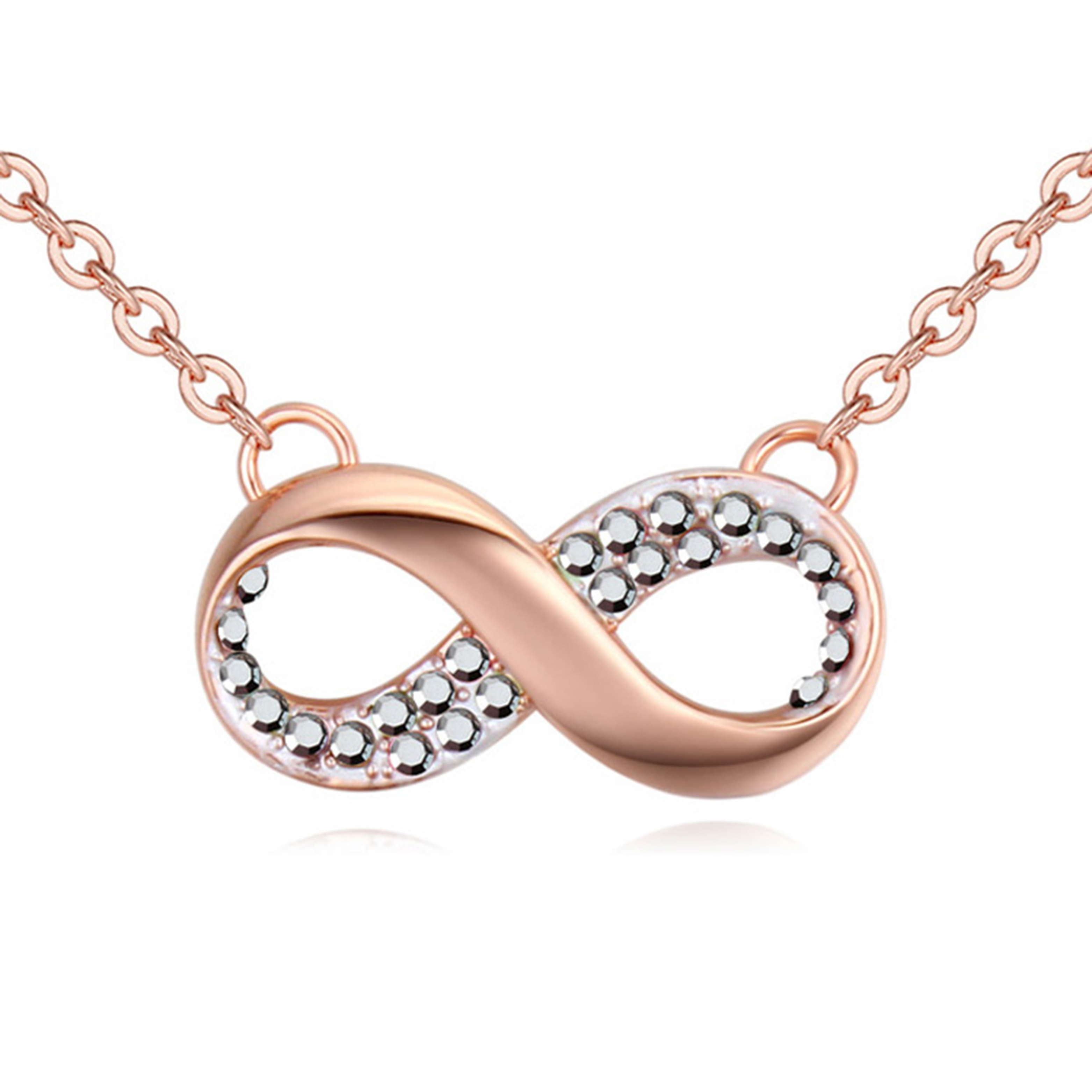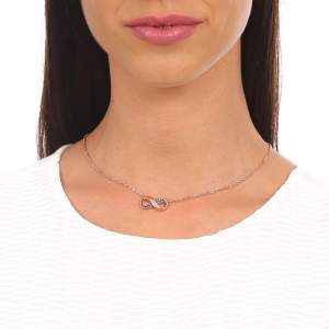 Collar en baño de oro rosa de 18 quilates, diseño de infinito con incrustaciones de cristales en color Oxford. Fabricado en una estructura de aleación de platino con rodio sin níquel.