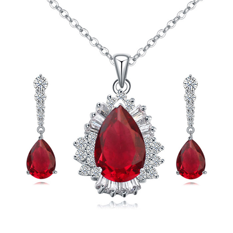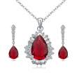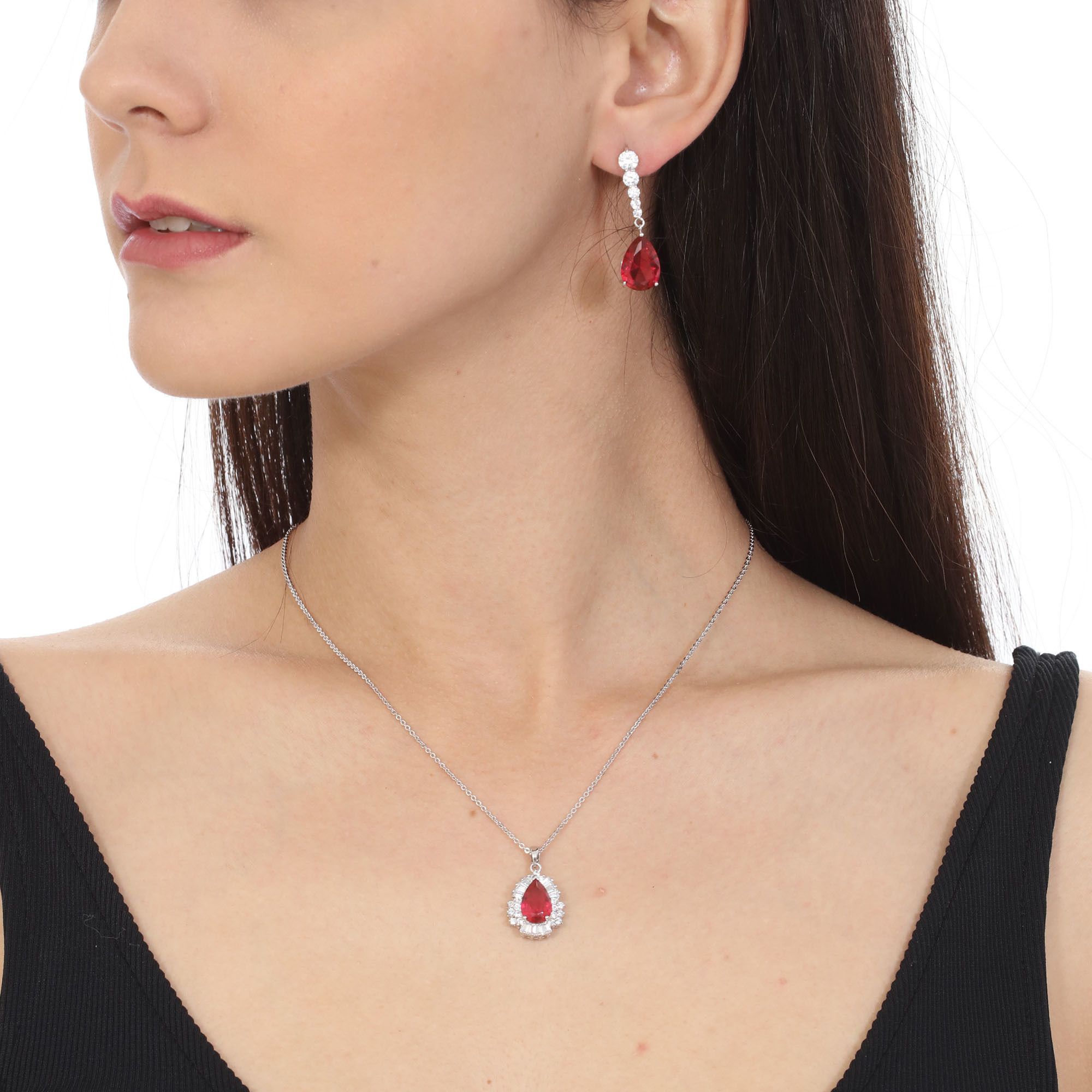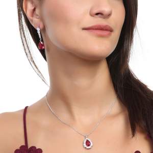 Juego de aretes y dije con cadena en baño de oro blanco de 18 quilates , fino diseño de gota, cristales rojoos corte brillante e incrustaciones de cristales en color blanco. Fabricado en una estructura de aleación de platino con rodio sin níquel.