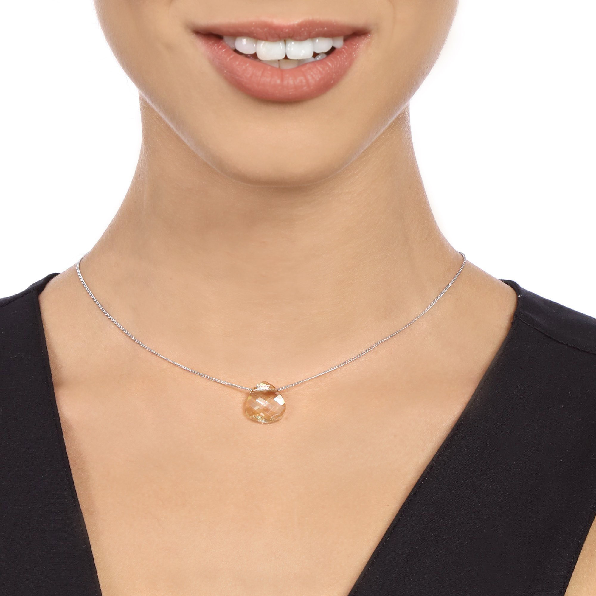 Dije de cristal color ámbar en forma de gota, con cadena en baño de oro blanco de 18 quilates. Fabricado en una estructura de aleación de platino con rodio sin níquel.