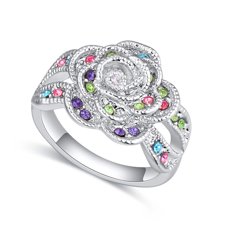 Delicado anillo, en baño de oro blanco de 18 quilates, diseño de rosa con incrustaciones de cristales en colores. Fabricado en una estructura de aleación de platino con rodio sin níquel.