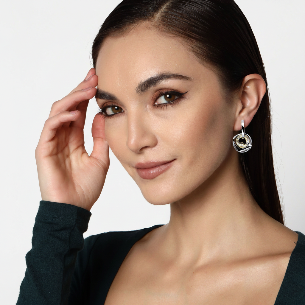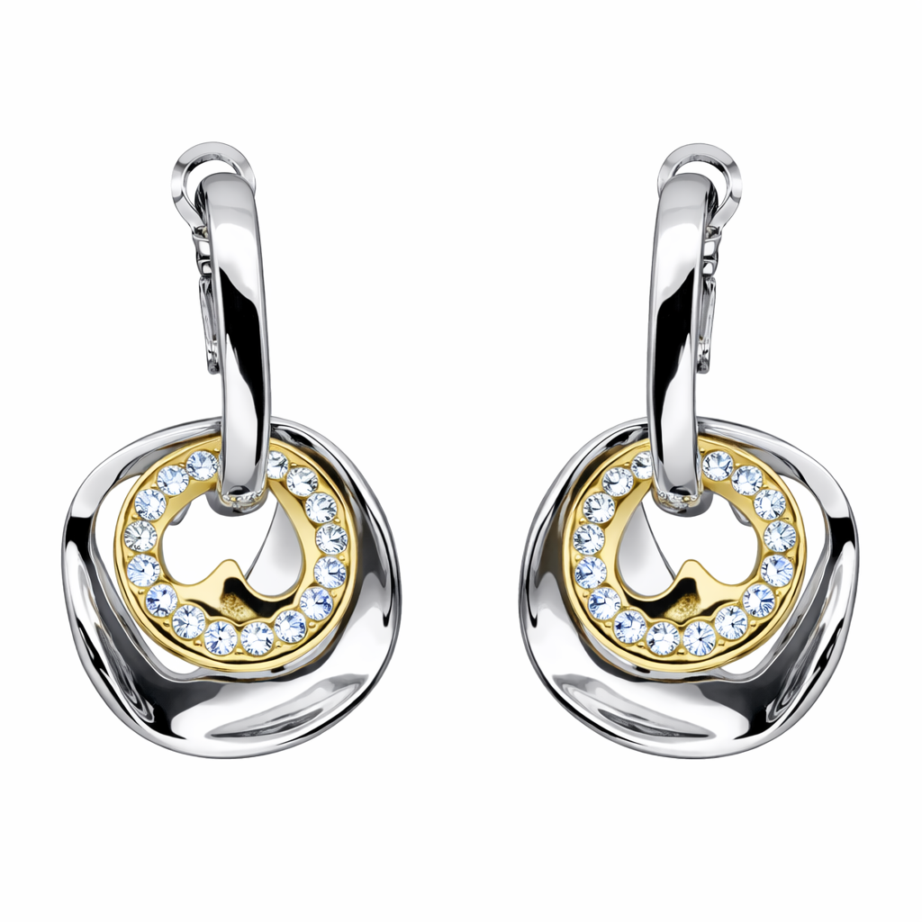 Originales arracadas en baño de oro blanco y amarillo de 18 quilates diseño original con corazón e incrustaciones de cristales blancos. Fabricado en una estructura de aleación de platino con rodio sin níquel.