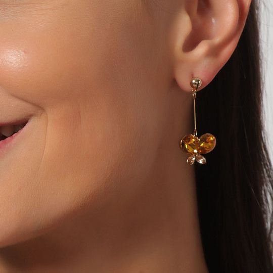 Bellos aretes en baño de oro amarillo de 18 quilates con mariposas de cristal ámbar e incrustaciones de cristales. Fabricado en una estructura de aleación de platino con rodio sin níquel.