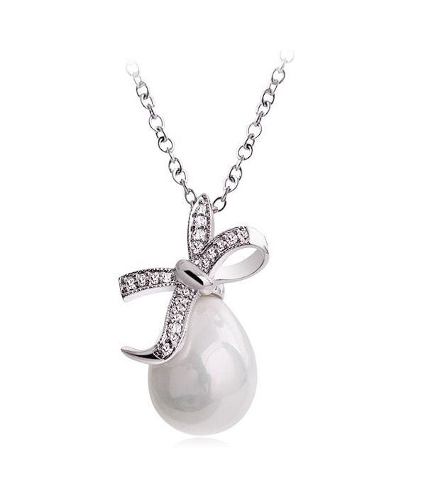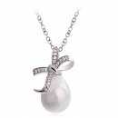 Precioso dije en baño de oro blanco de 18 quilates, con perla en forma de gota acompañada de un moño con incrustaciones de cristales blancos, incluye cadena. Fabricado en una estructura de aleación de platino con rodio sin níquel.