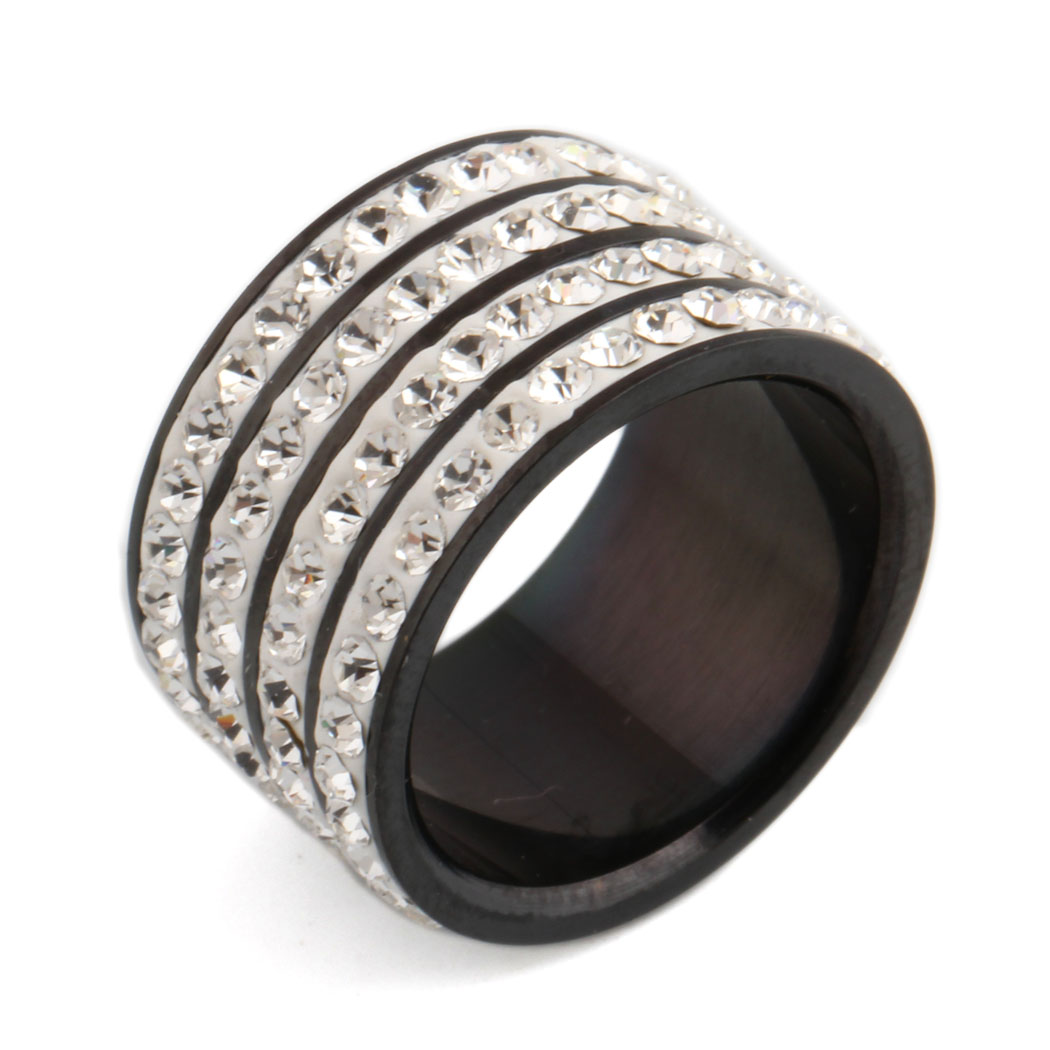 Anillo de acero inoxidable en color negro, fino diseño, con cuatro hileras de cristales en color blanco.