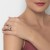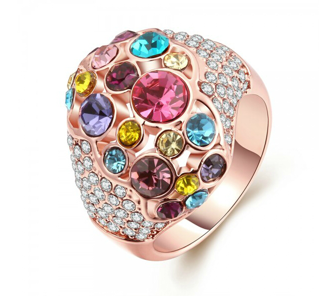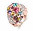 Anillo en baño de oro rosa de 18 quilates, original diseño, con cristales de colores al centro e incrustación de cristales blancos a los lados.
