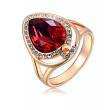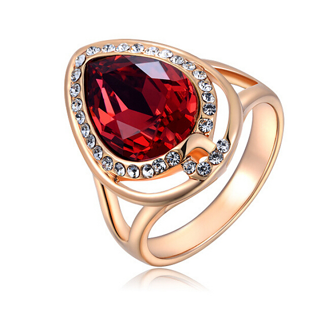Anillo en baño de oro rosa de 18 quilates, diseño de gota con cristal rojo corte pera e incrustaciones de cristales blancos. Fabricado en una estructura de aleación de platino con rodio sin níquel.