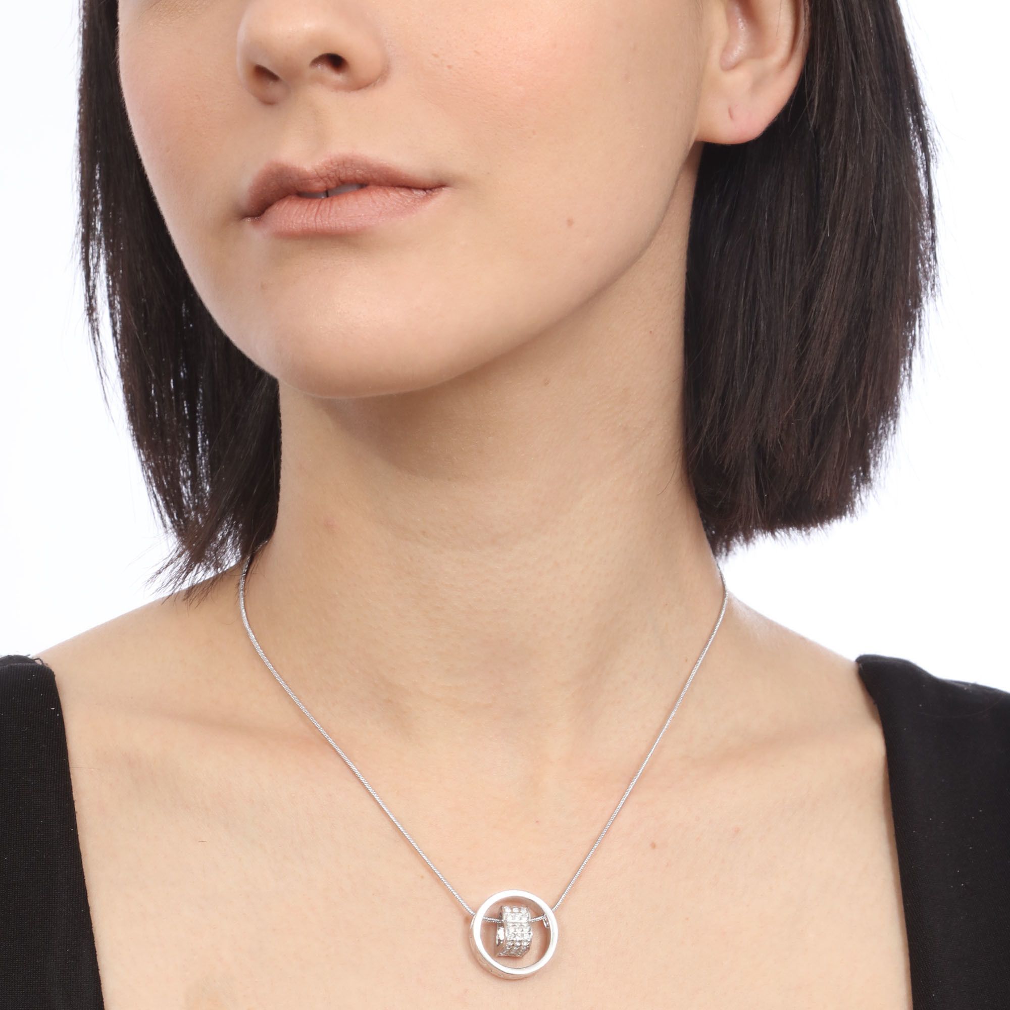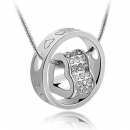 Hermoso dije en baño de oro blanco de 18 quilates, diseño de circulo y corazón con incrustaciones de cristales en color blanco. Fabricado en una estructura de aleación de platino con rodio sin níquel.