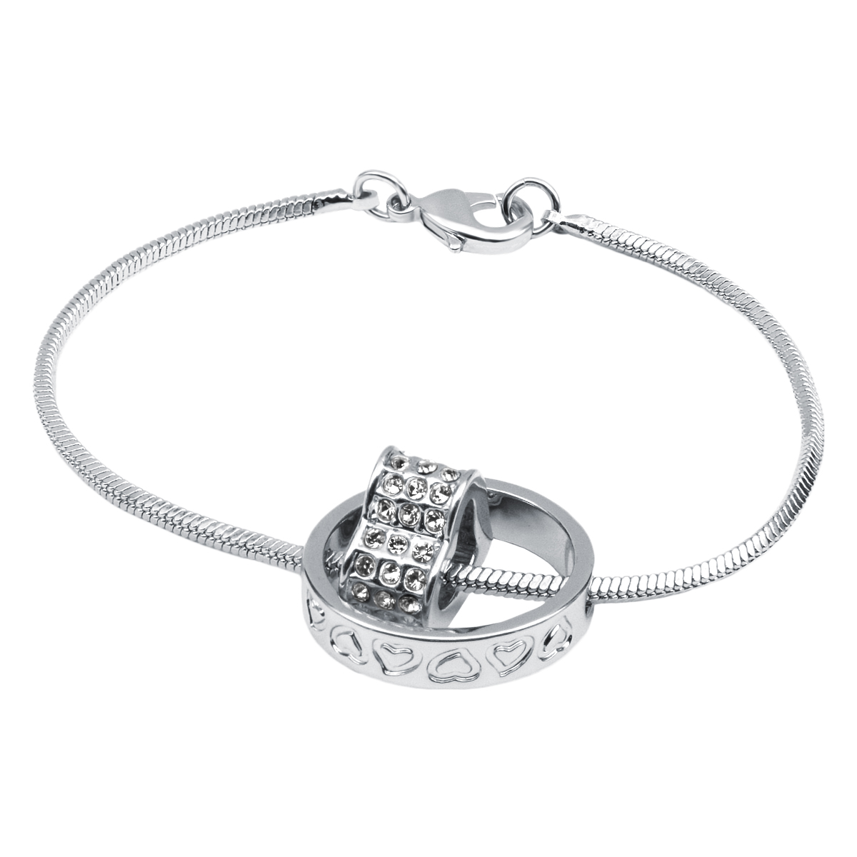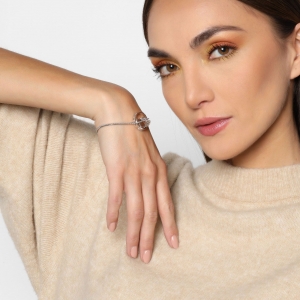 Brazalete en baño de oro blanco de 18 quilates, diseño de corazón y circulo con incrustaciones de cristales en color blanco. Fabricado en una estructura de aleación de platino con rodio sin níquel.