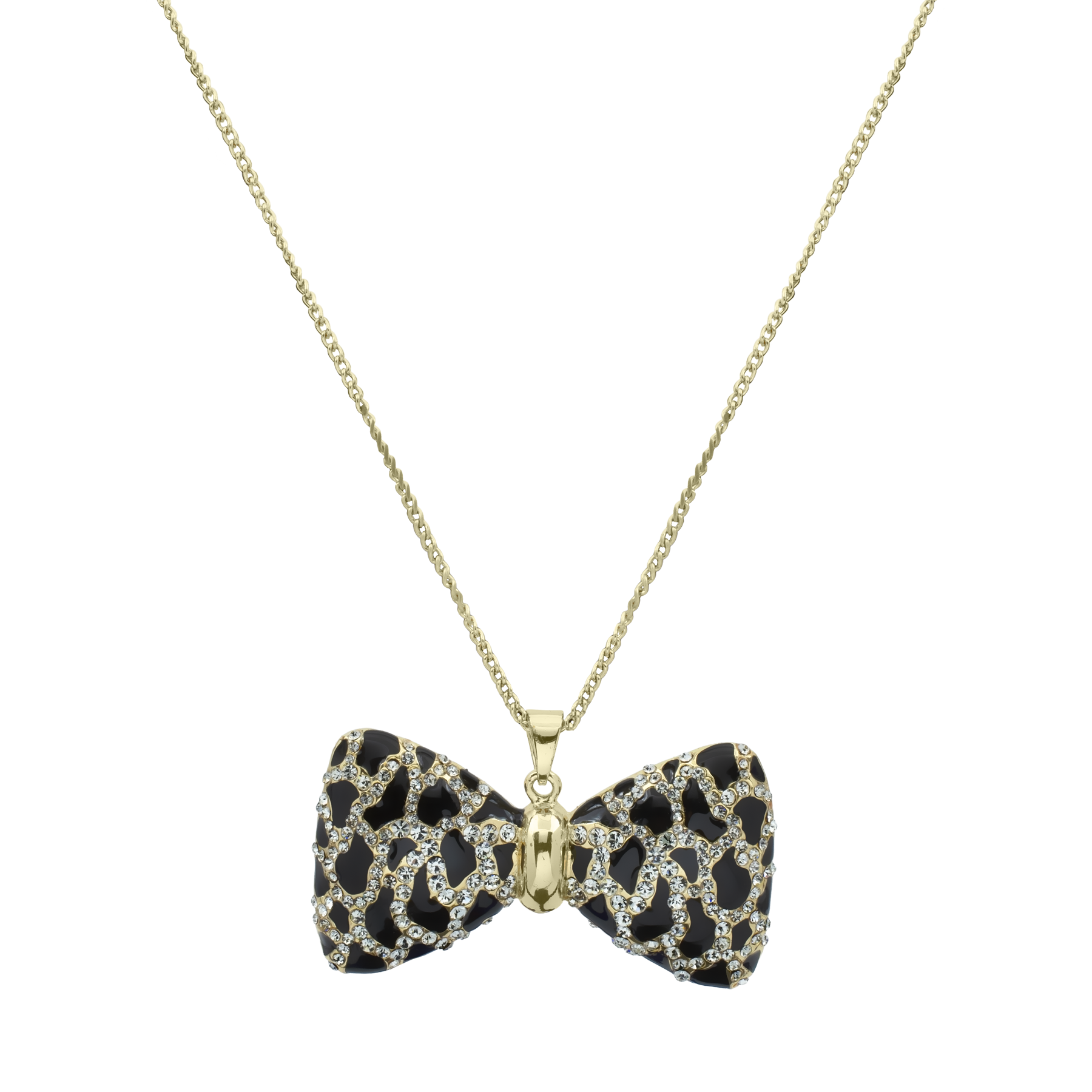 Hermoso collar para Sweater, en baño de oro blanco de 18 quilates, diseño de moño con esmaltado negro animal print e incrustaciones de cristales en color blanco. Fabricado en una estructura de aleación de platino con rodio sin níquel. 1. Joyería Hipo alergénica. 2. Incluye cajita de Joyería. 3. Garantía de 30 días por defectos de fabrica.
