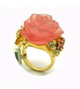 Elegante y original anillo, en baño de oro amarillo de 18 quilates, con rosa de cristal opaco color rosado, flores esmaltadas en rosa y verde limón e incrustaciones de cristales blancos. Fabricado en una estructura de aleación de platino con rodio sin níquel.