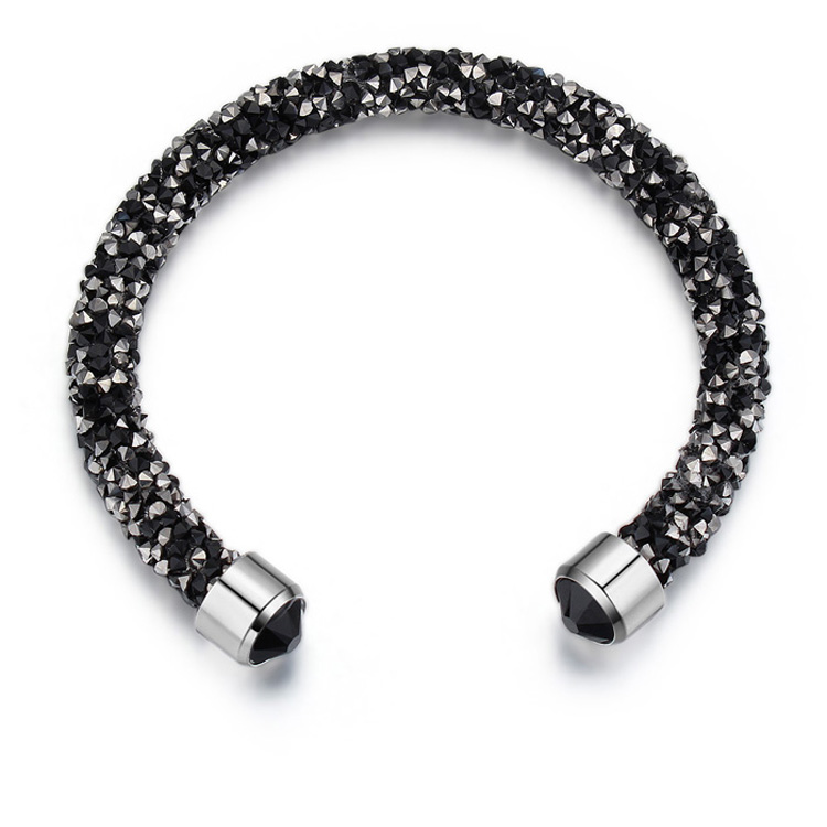 Brazalete con detalles de baño de oro blanco de 18 quilates y cristales en color blanco y negro. Fabricado en una estructura de aleacion de platino con rodio sin niquel. 1. Joyeria Hipo alergenica. 2. Incluye cajita de Joyeria. 3. Garantia de 30 dias por defectos de fabrica.