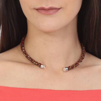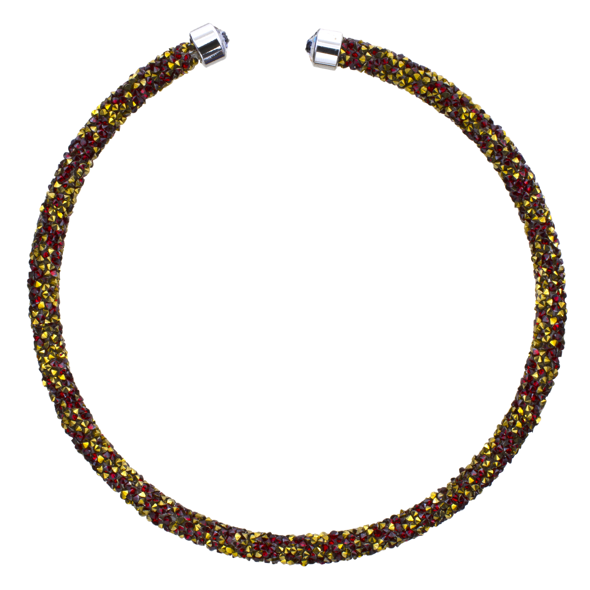 Gargantilla con detalles de baño de oro blanco de 18 quilates y cristales en color blanco, dorado y rojo en todo la gargantilla. Fabricado en una estructura de aleación de platino con rodio sin níquel. 1. Joyería Hipo alergénica. 2. Incluye cajita de Joyería. 3. Garantía de 30 días por defectos de fabrica.