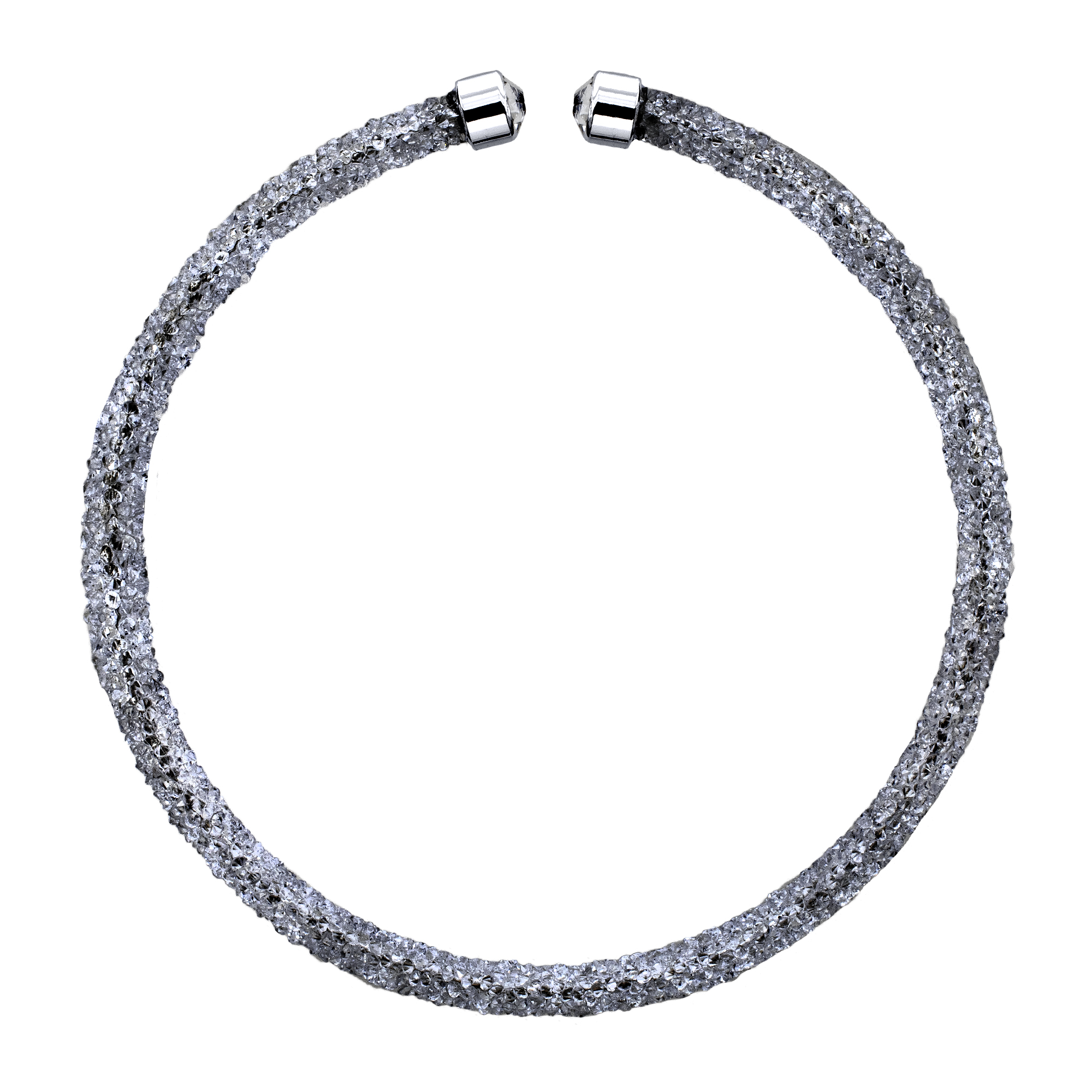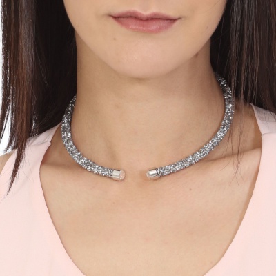 Gargantilla con detalles de baño de oro blanco de 18 quilates y cristales en color gris y blanco en todo la gargantilla. Fabricado en una estructura de aleación de platino con rodio sin níquel. 1. Joyería Hipo alergénica. 2. Incluye cajita de Joyería. 3. Garantía de 30 días por defectos de fabrica.