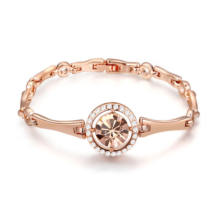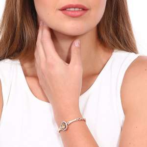 Brazalete en baño de oro rosa de 18 quilates, fino diseño de circulo con incrustaciones de cristales en color ámbar y blanco. Fabricado en una estructura de aleación de platino con rodio sin níquel.