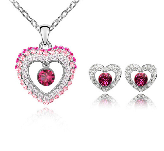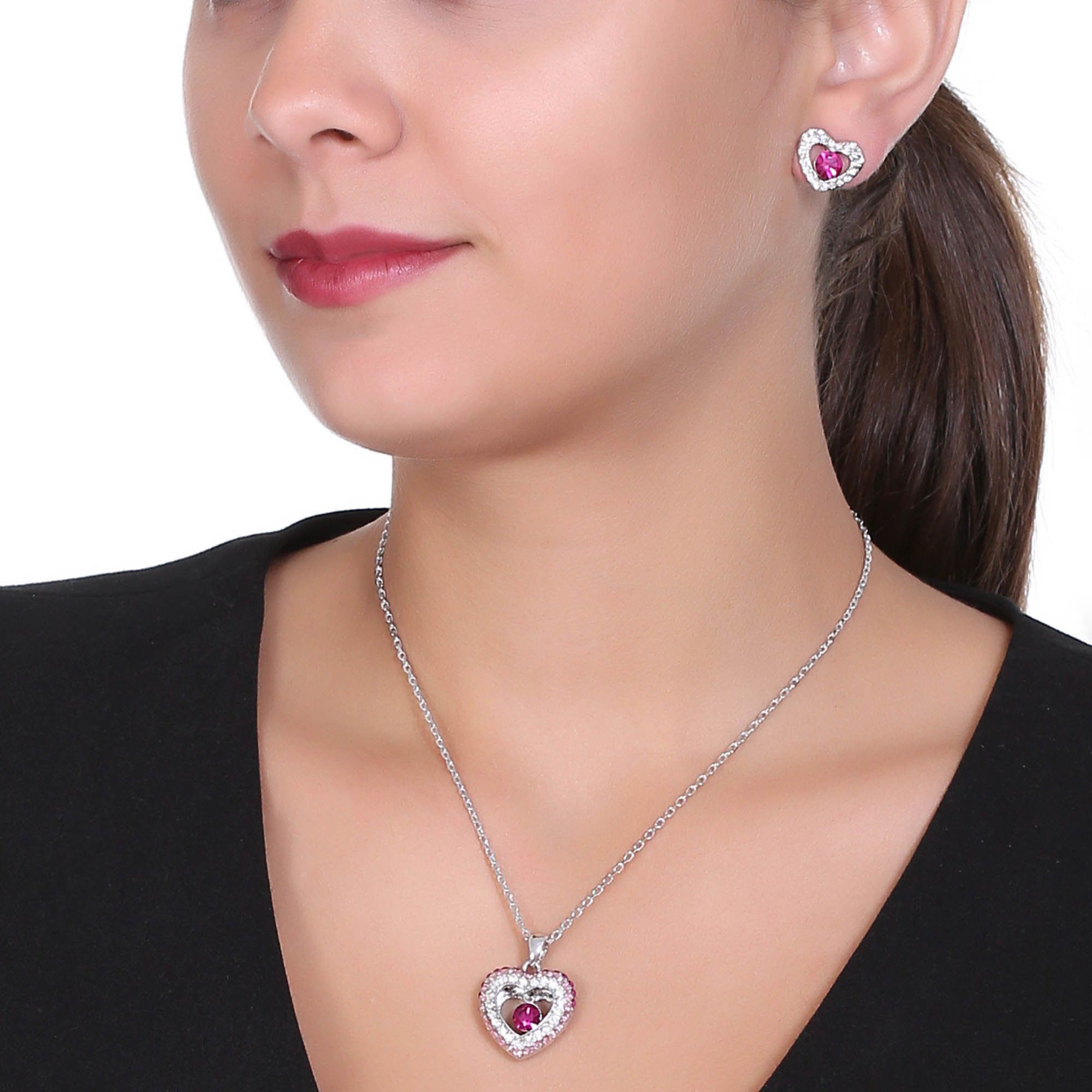 Juego de aretes y dije con cadena en baño de oro blanco de 18 quilates , diseño de corazón con incrustaciones de cristales en color blanco y rosa. Fabricado en una estructura de aleación de platino con rodio sin níquel.