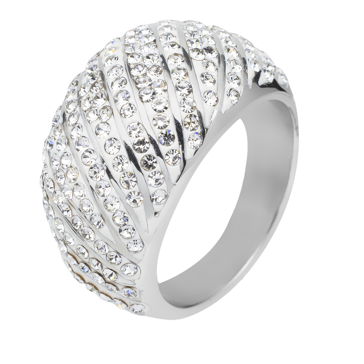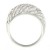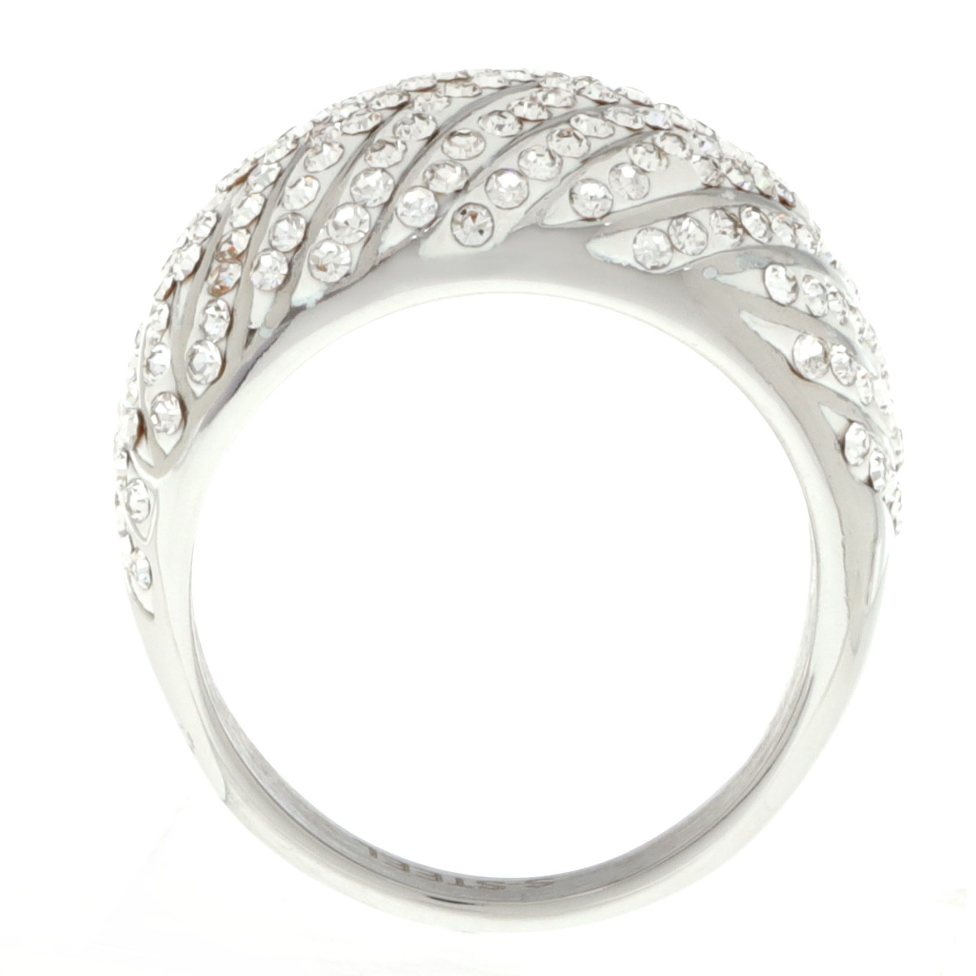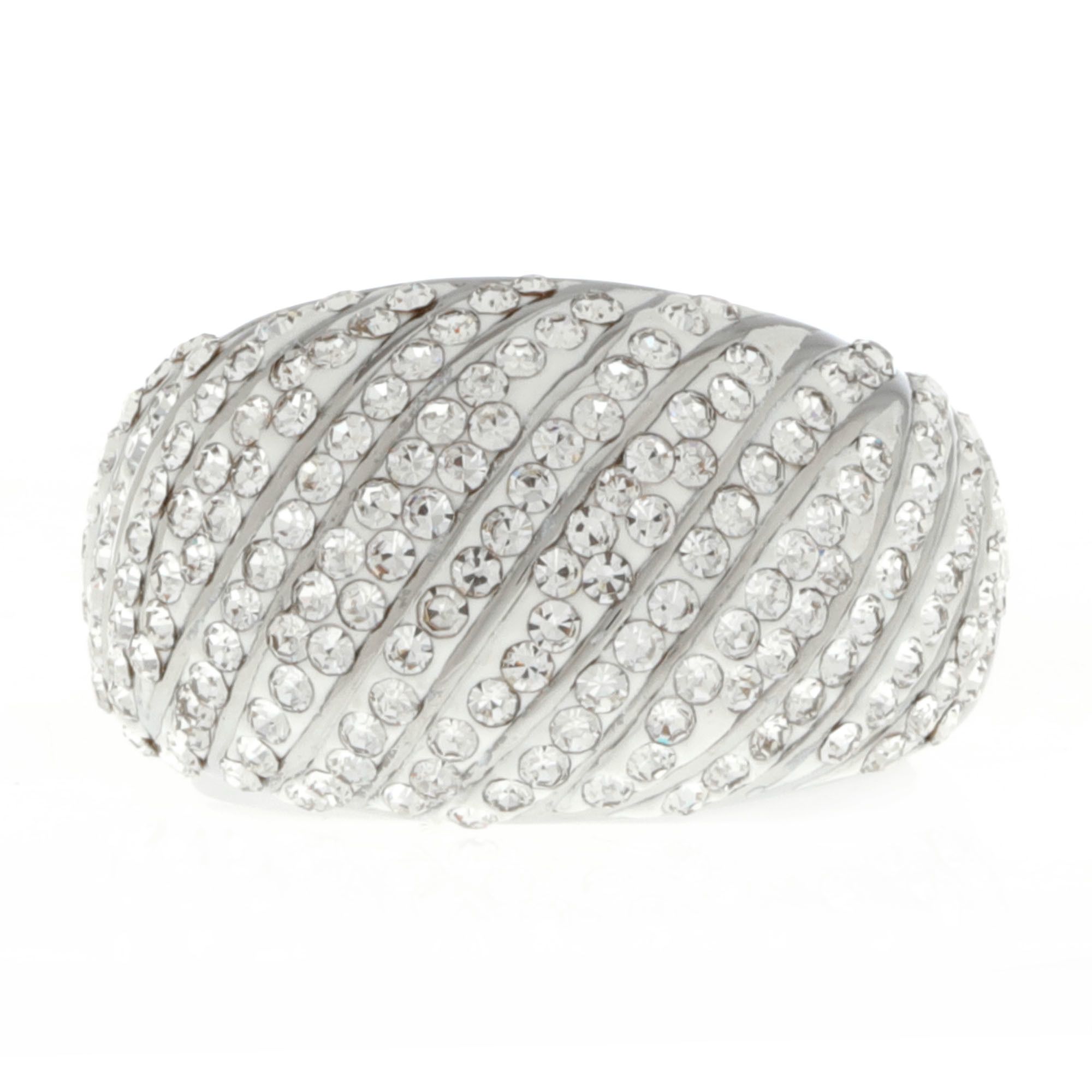 Delicado anillo en baño de oro blanco de 18 quilates, fino diseño de curvas en diagonal, fondo blanco e incrustaciones de cristales blancos. Fabricado en una estructura de aleación de platino con rodio sin níquel.