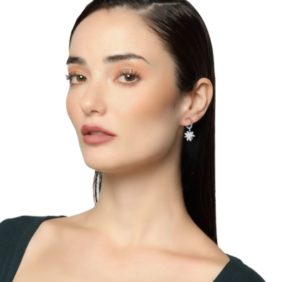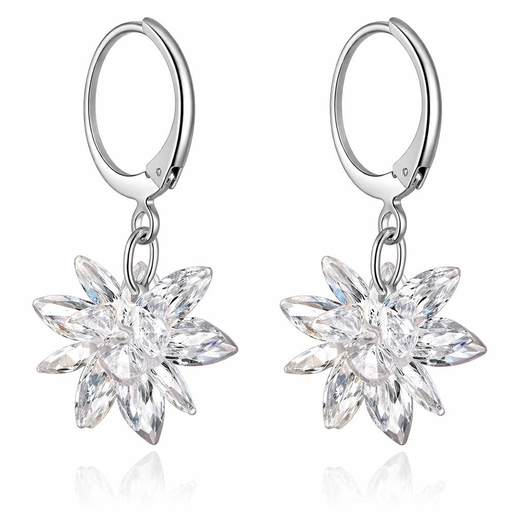 Lindos aretes en baño de oro blanco de 18 quilates, diseño de flor con cristales color blanco. Fabricado en una estructura de aleación de platino con rodio sin níquel.