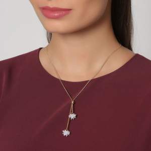 Original collar en baño de oro amarillo de 18 quilates, diseño con cristales blancos formando una flor. Fabricado en una estructura de aleación de platino con rodio sin níquel.