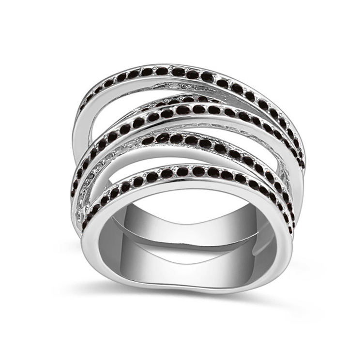 Hermoso anillo en baño de oro blanco de 18 quilates, fino diseño estilo anillo múltiple, con aros entrelazados e incrustaciones de cristales en color negro. Fabricado en una estructura de aleación de platino con rodio sin níquel.