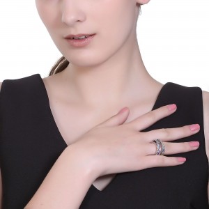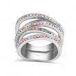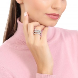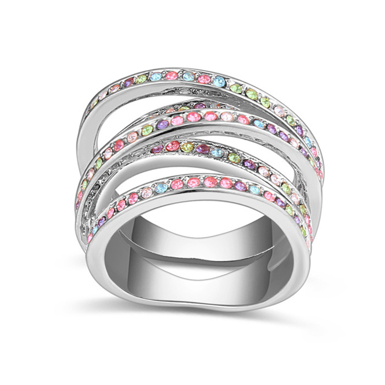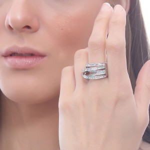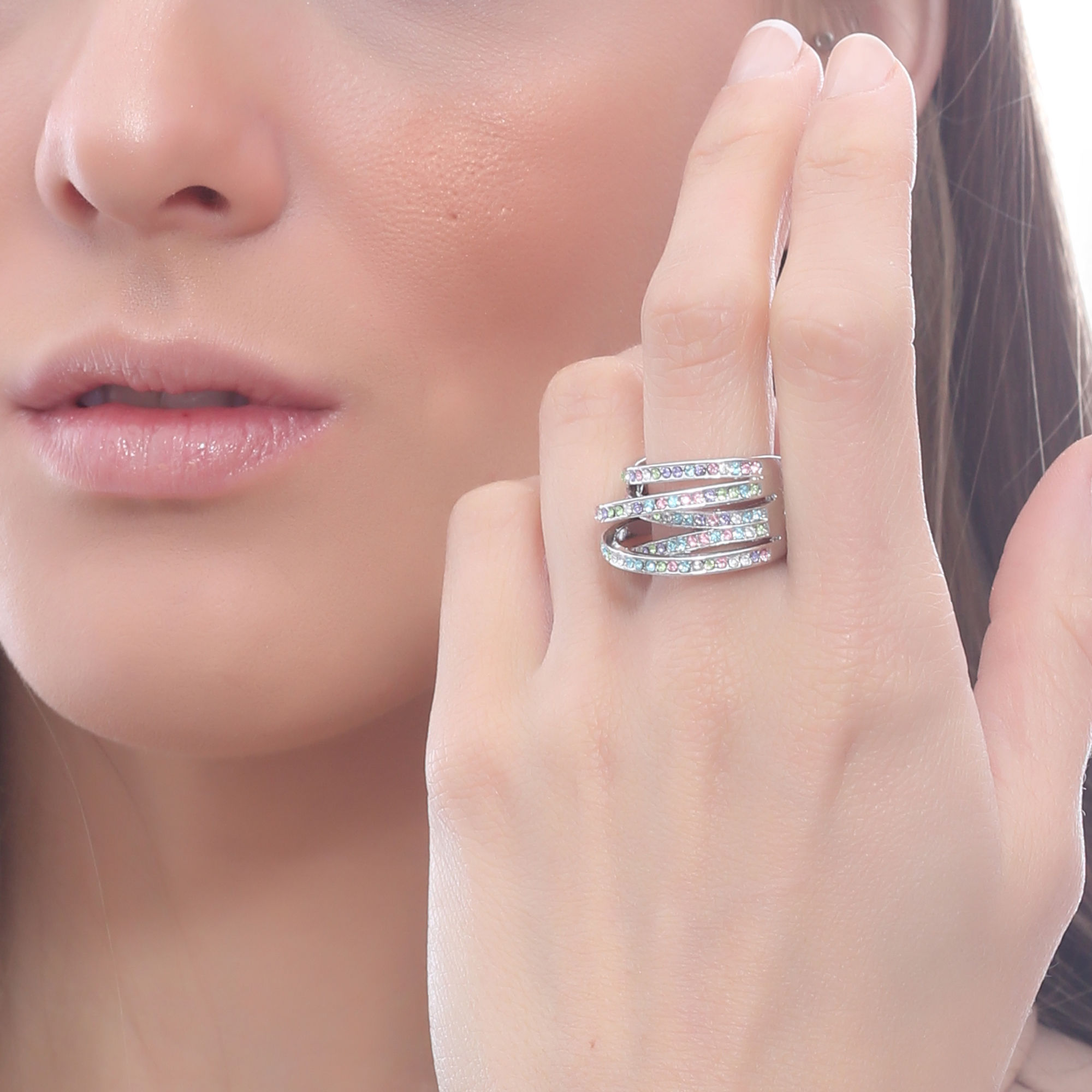Hermoso anillo en baño de oro blanco de 18 quilates, fino diseño estilo anillo múltiple, con aros entrelazados e incrustaciones de cristales en colores. Fabricado en una estructura de aleación de platino con rodio sin níquel.
