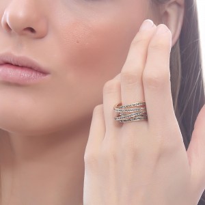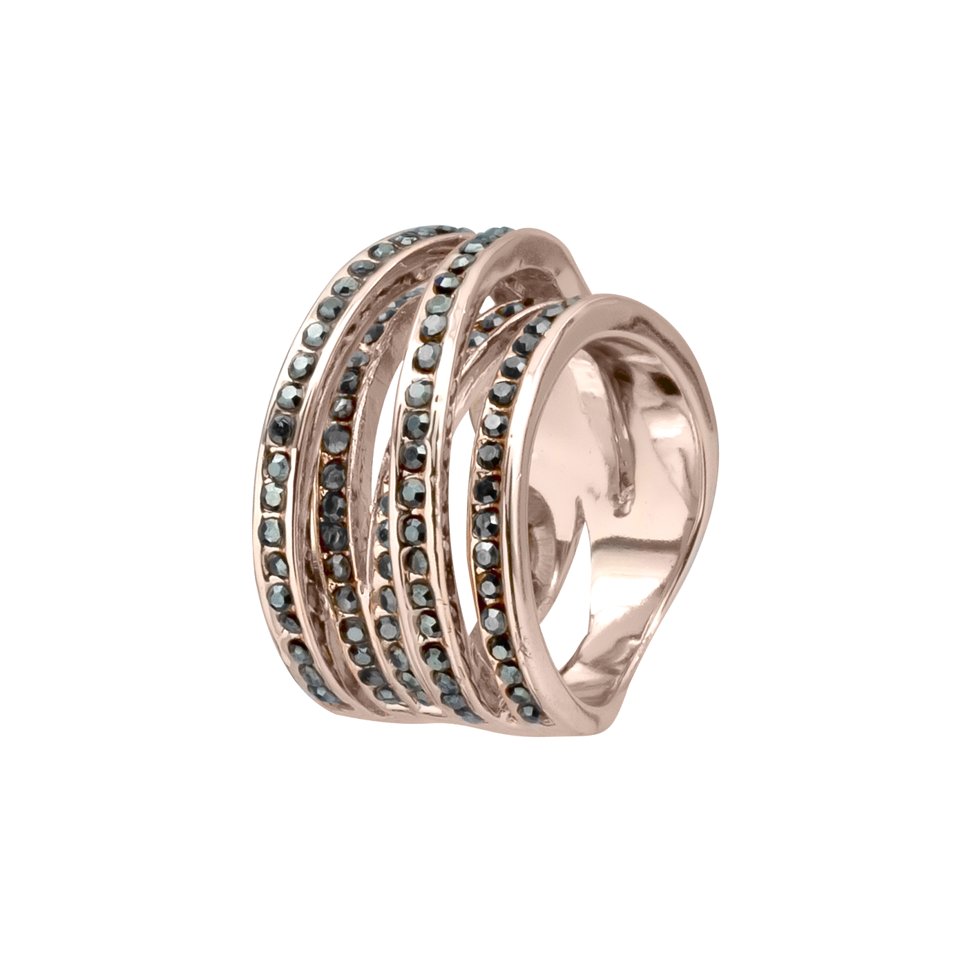 Hermoso anillo en baño de oro rosa de 18 quilates, fino diseño estilo anillo múltiple, con aros entrelazados e incrustaciones de cristales color oxford. Fabricado en una estructura de aleación de platino con rodio sin níquel.