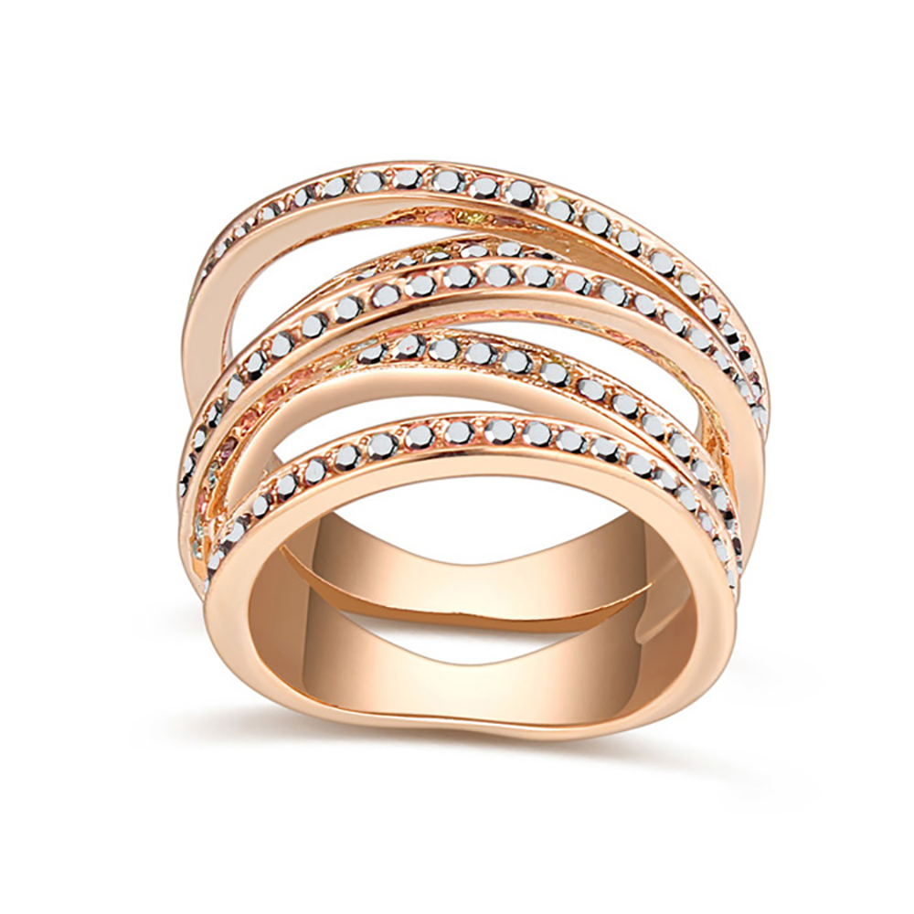 Hermoso anillo en baño de oro amarillo de 18 quilates, fino diseño estilo anillo múltiple, con aros entrelazados e incrustaciones de cristales en color oxford. Fabricado en una estructura de aleación de platino con rodio sin níquel.