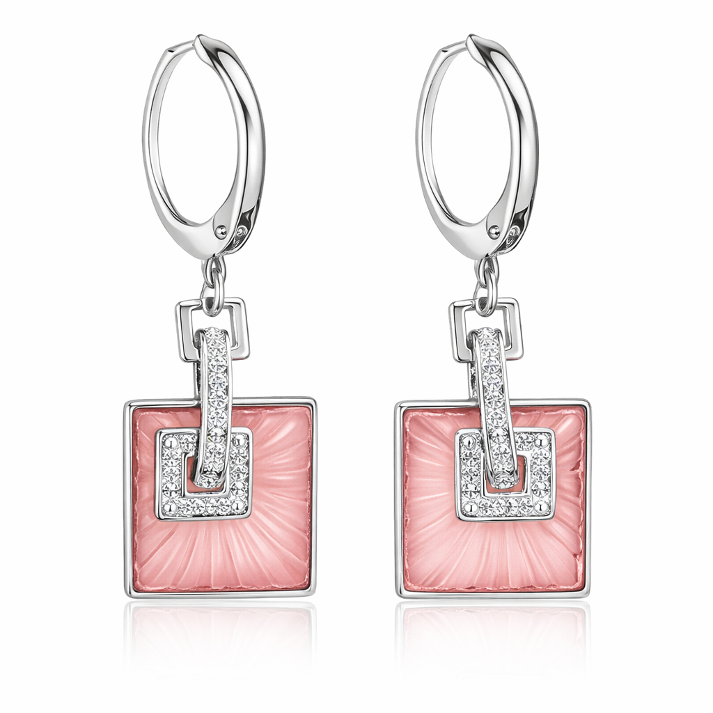 Modernos aretes en baño de oro blanco de 18 quilates con original diseño cuadrado de cristal durazno opaco e incrustaciones de cristales blancos. Fabricado en una estructura de aleación de platino con rodio sin níquel.