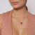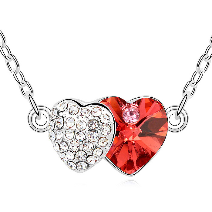 Tierno y femenino collar en baño de oro blanco de 18 quilates, diseño de corazones unidos, con cristal rojo e incrustaciones de cristales blancos. Fabricado en una estructura de aleación de platino con rodio sin níquel.