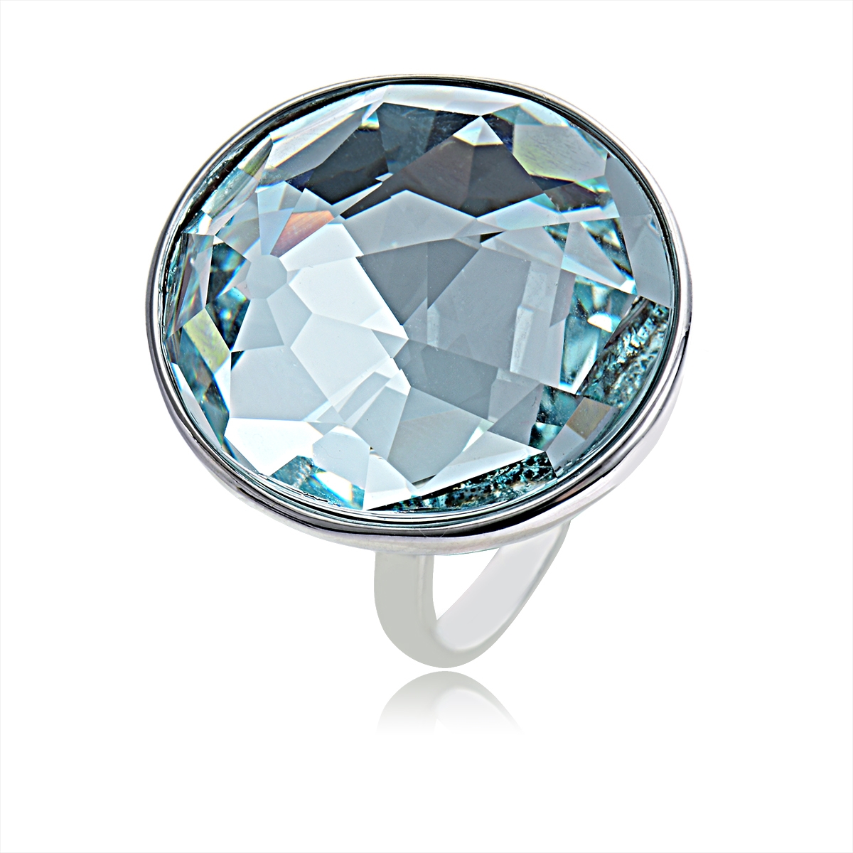 Hermoso anillo en baño de oro blanco de 18 quilates , diseño circular, con cristal azul celeste corte biselado.