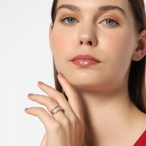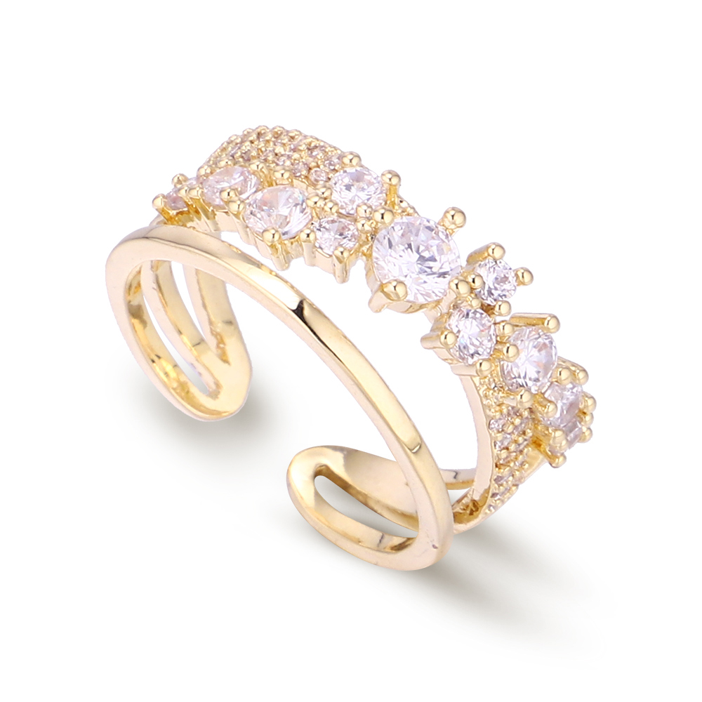 Fino anillo en baño de oro amarillo de 18 quilates , diseño cruzado, con incrustaciones de cristales blancos.