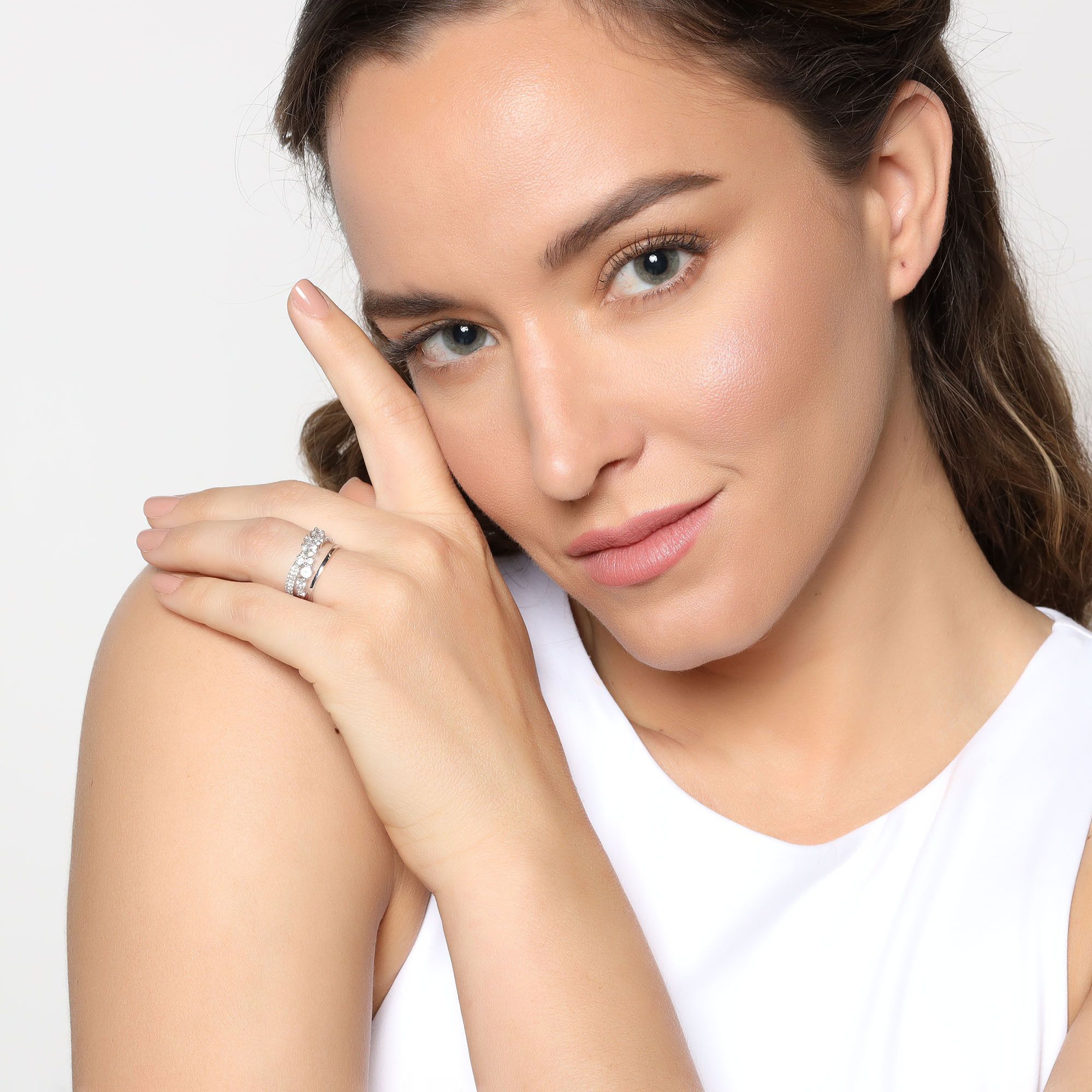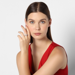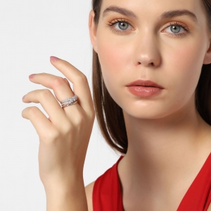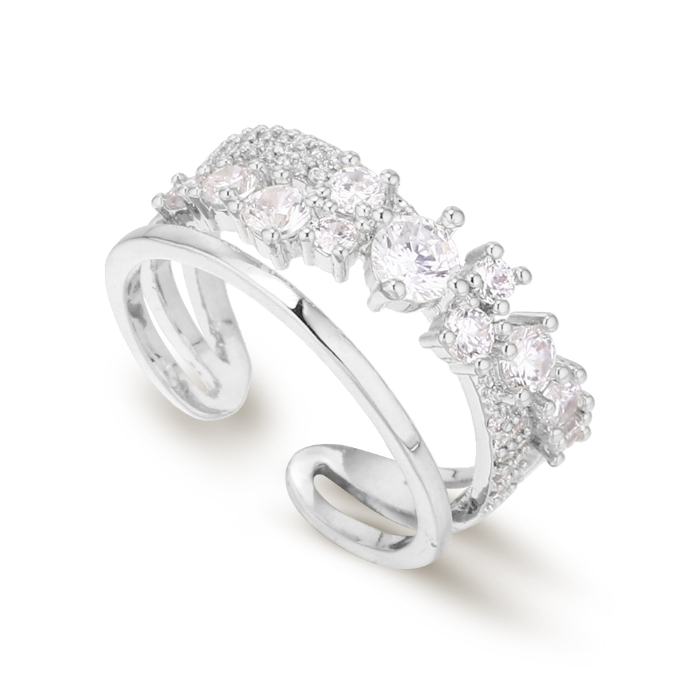 Fino anillo en baño de oro blanco de 18 quilates , diseño cruzado, con incrustaciones de cristales blancos.