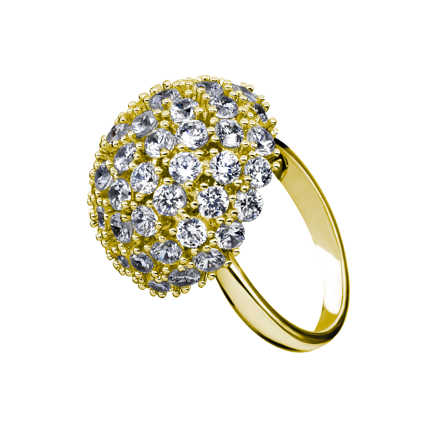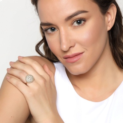 Elegante anillo en baño de oro amarillo de 18 quilates , diseño de semiesfera giratoria, con incrustaciones de cristales blancos.