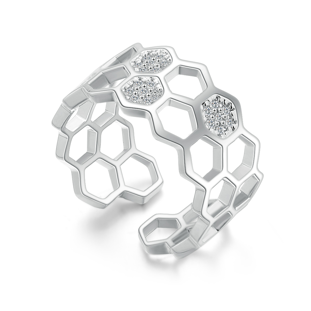 Original anillo en baño de oro blanco de 18 quilates , diseño de panal, con incrustaciones de cristales blancos.