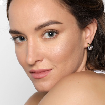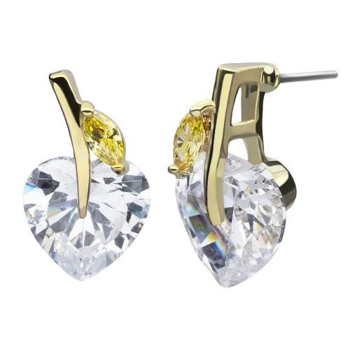Tiernos aretes en baño de oro amarillo de 18 quilates , diseño de manzana formada por un cristal blanco corte corazón y cristal ámbar corte marquesa.