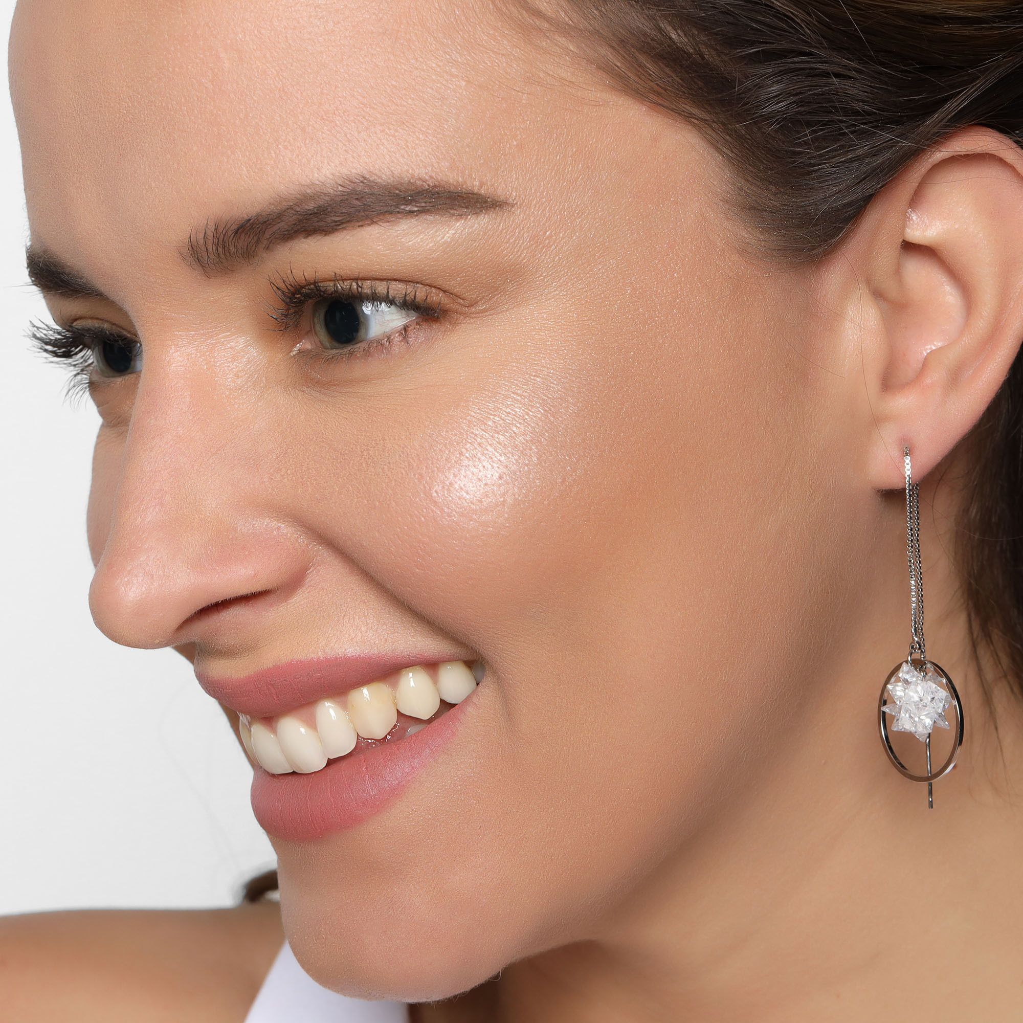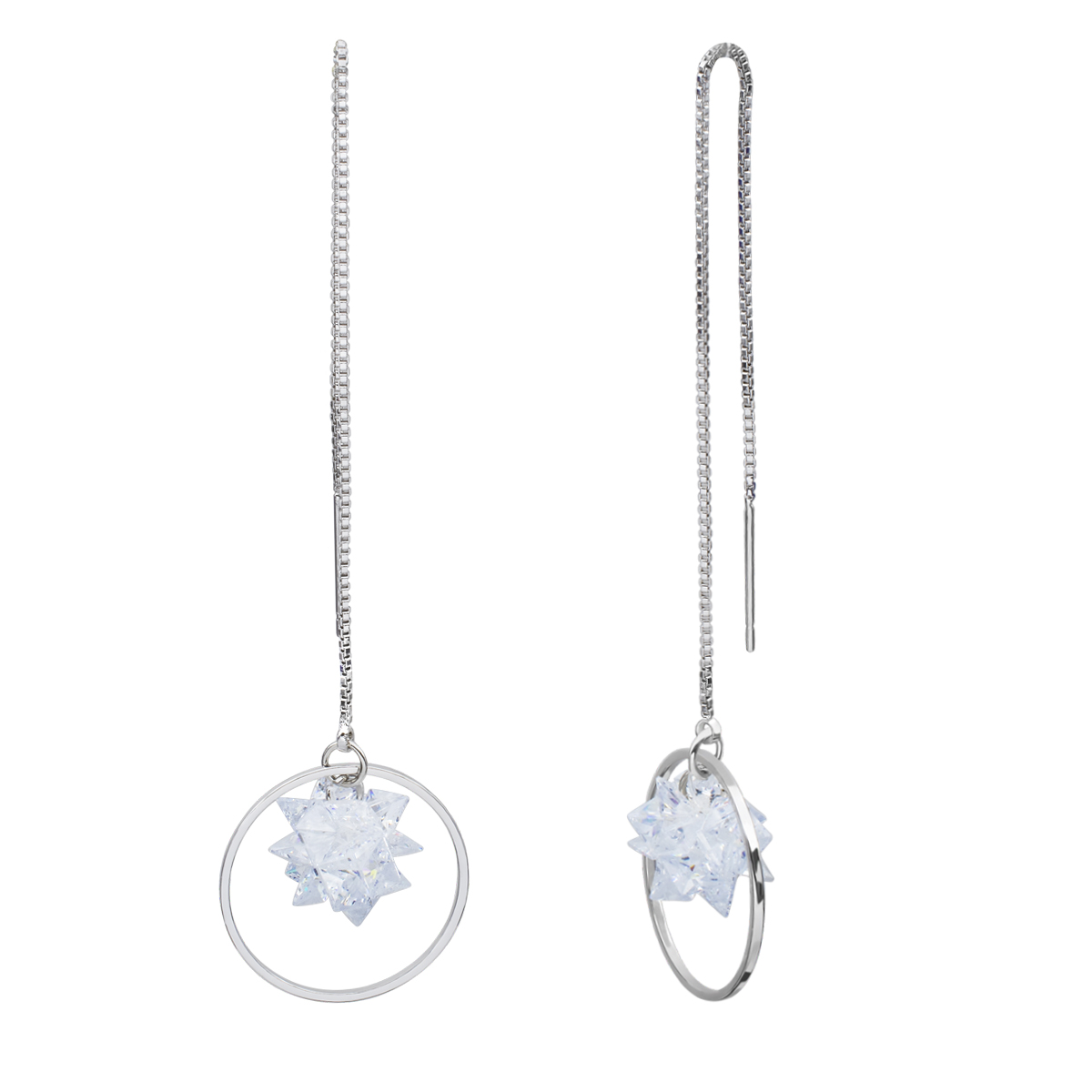 Modernos pendientes en baño de oro blanco de 18 quilates , diseño de aros y estrellas formadas por cristales blancos corte lozenge.