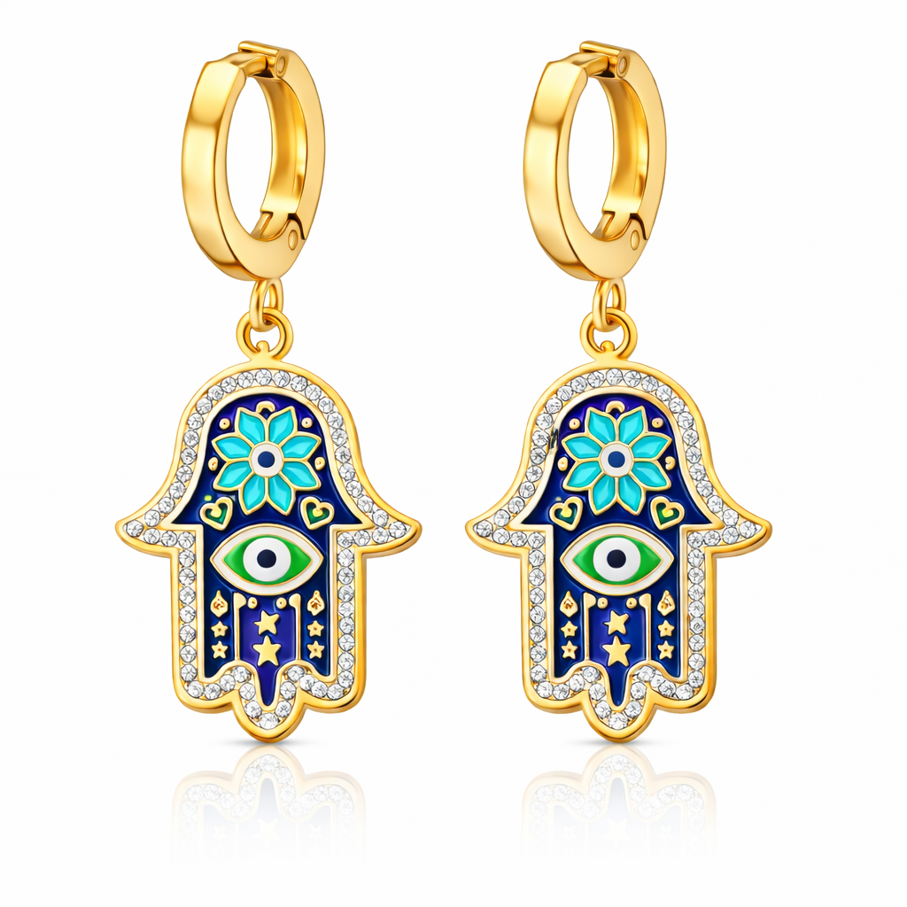 Aretes de acero inoxidable en tono amarillo, diseño de hamsa, esmaltado color azul con cristales blancos.